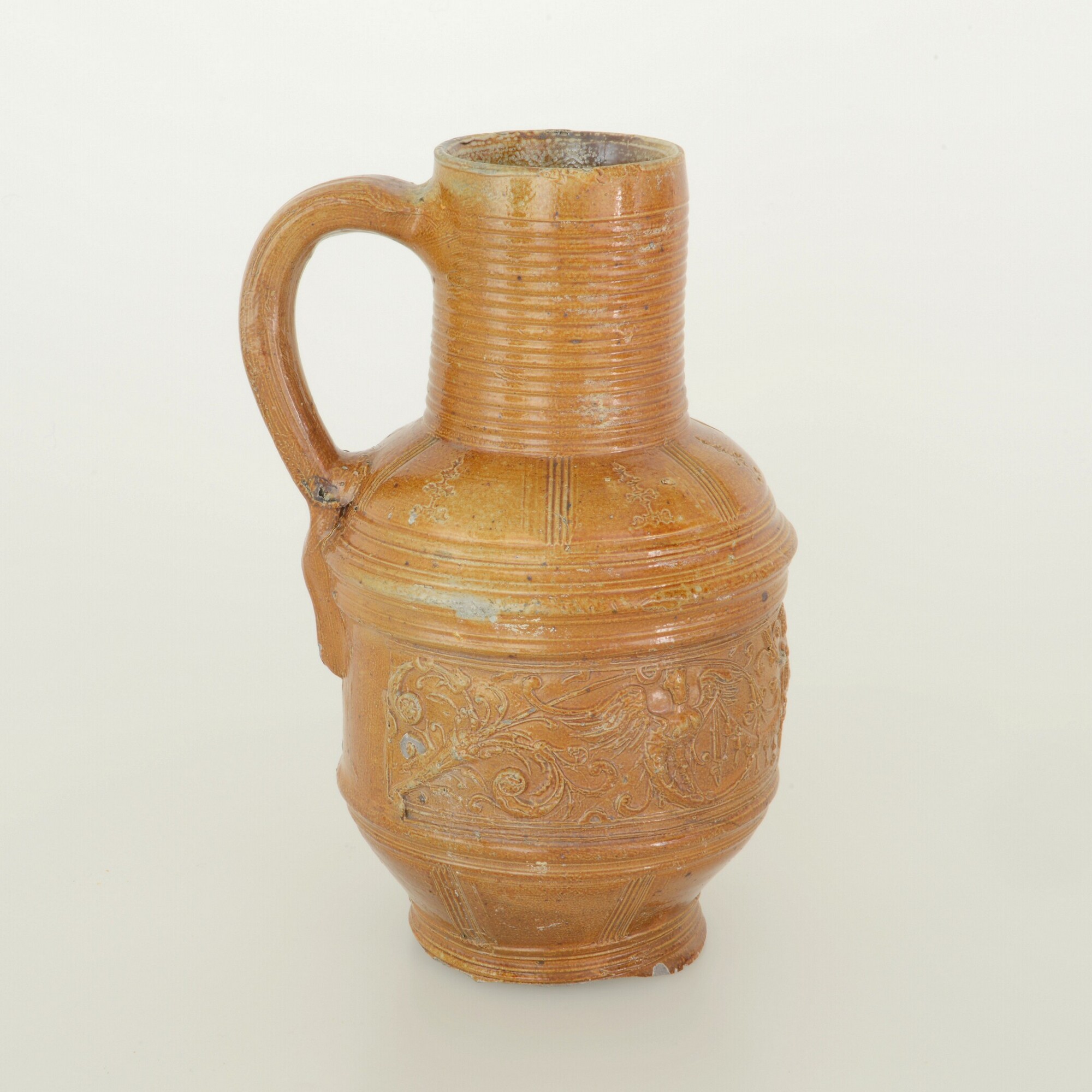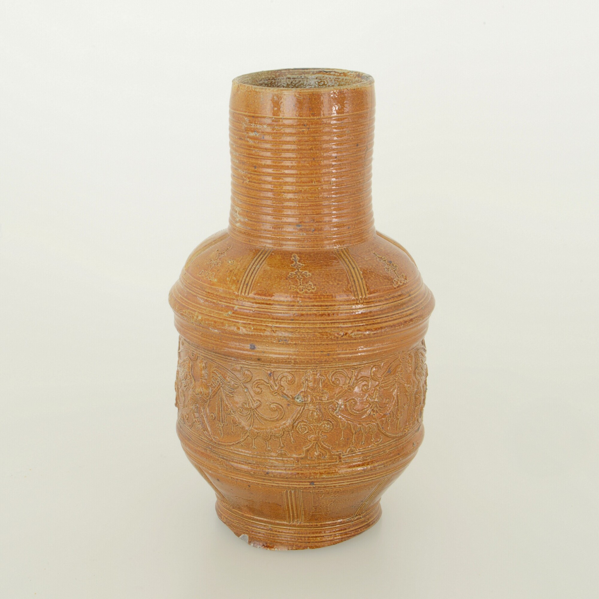 Kan; s2-kan-49; kan met op buik een cilindrische zone door ribbels gemarkeerd, hoge cilindrische hals, standvoet (ontbreekt); verticaal lintoor; steengoed met oppervlaktebehandeling: ijzerengobe en zoutglazuur; fries met bloemmotief, guirlandes en fabeldieren, op schouder verticale panelen met bloemstempels; herkomst: Raeren, Rijnland