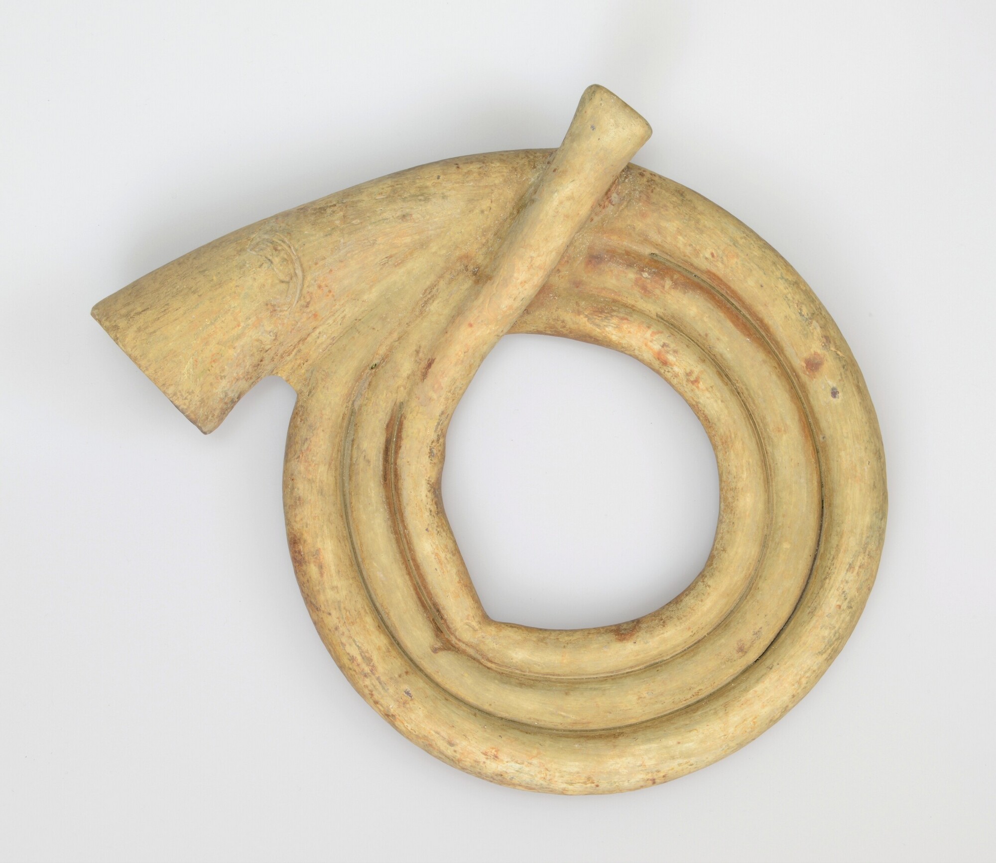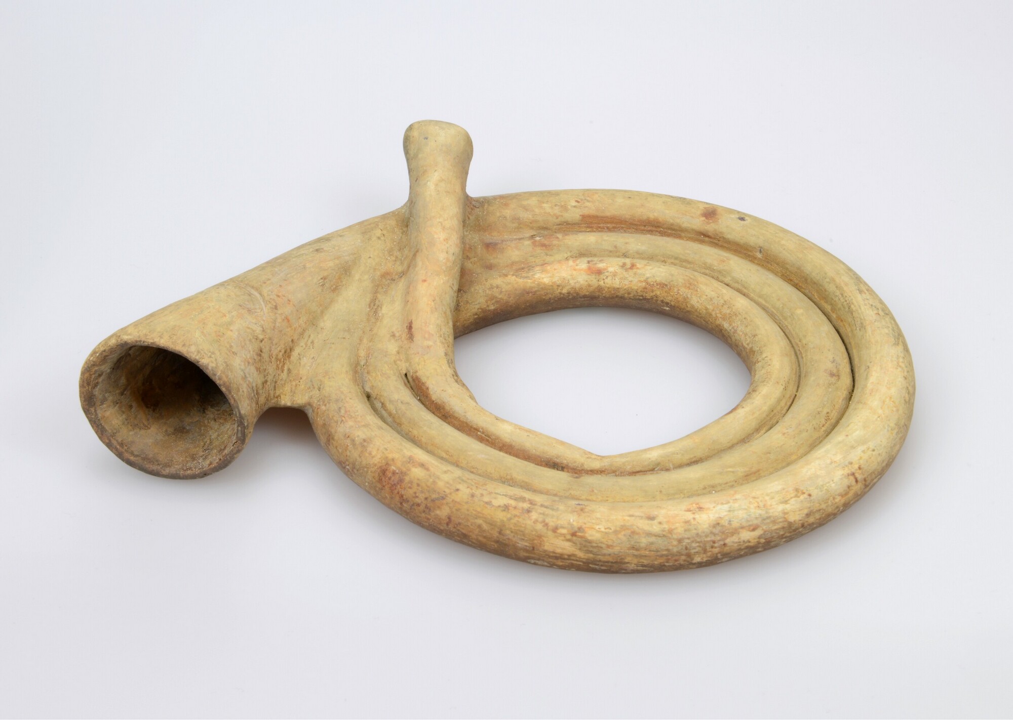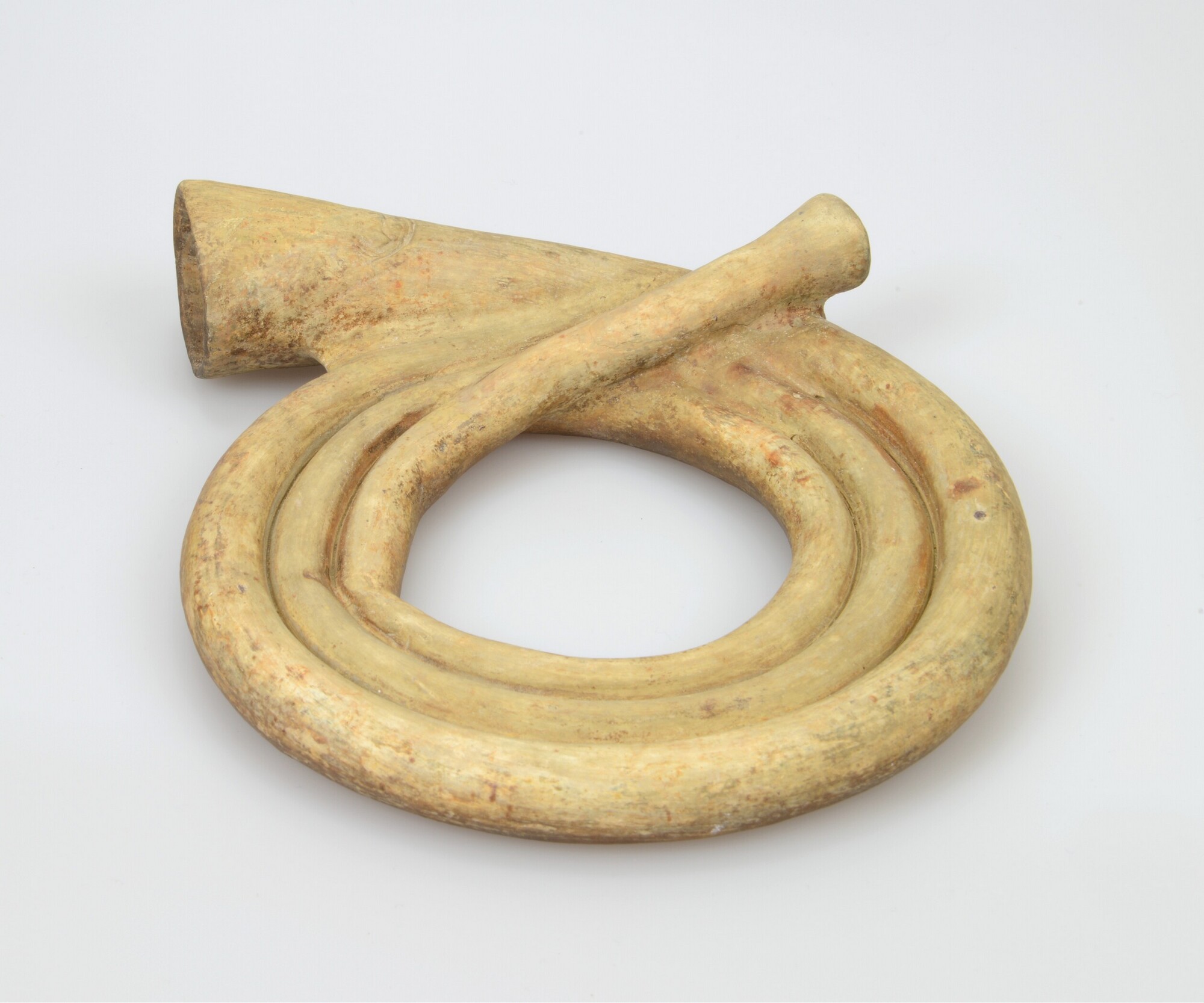 Pelgrimshoorn; py-hoo-1; rond model waldhoorn met stempel op de beker; het mondstuk is iets opgebogen; pijpaarde; herkomst: Langerwehe, Rijnland