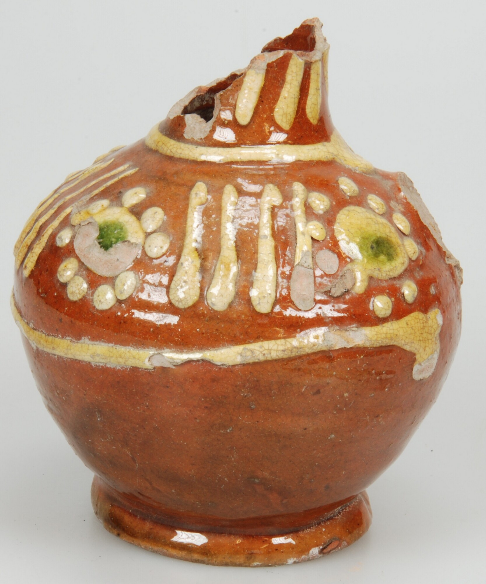 Kan; oliekan; r-kan-72; roodbakkend; in- en uitwendig loodglazuur; uitwendig in gele slib (ringeloor): op de hals een motief van vier verticale lijnen die onderbroken wordt door een grote stip met daaromheen kleinere stippen. Op de buik en bovenzijde hals twee aangebrachte horizontale lijnen; standring; verticaal worstoor (ontbreekt); Gouda