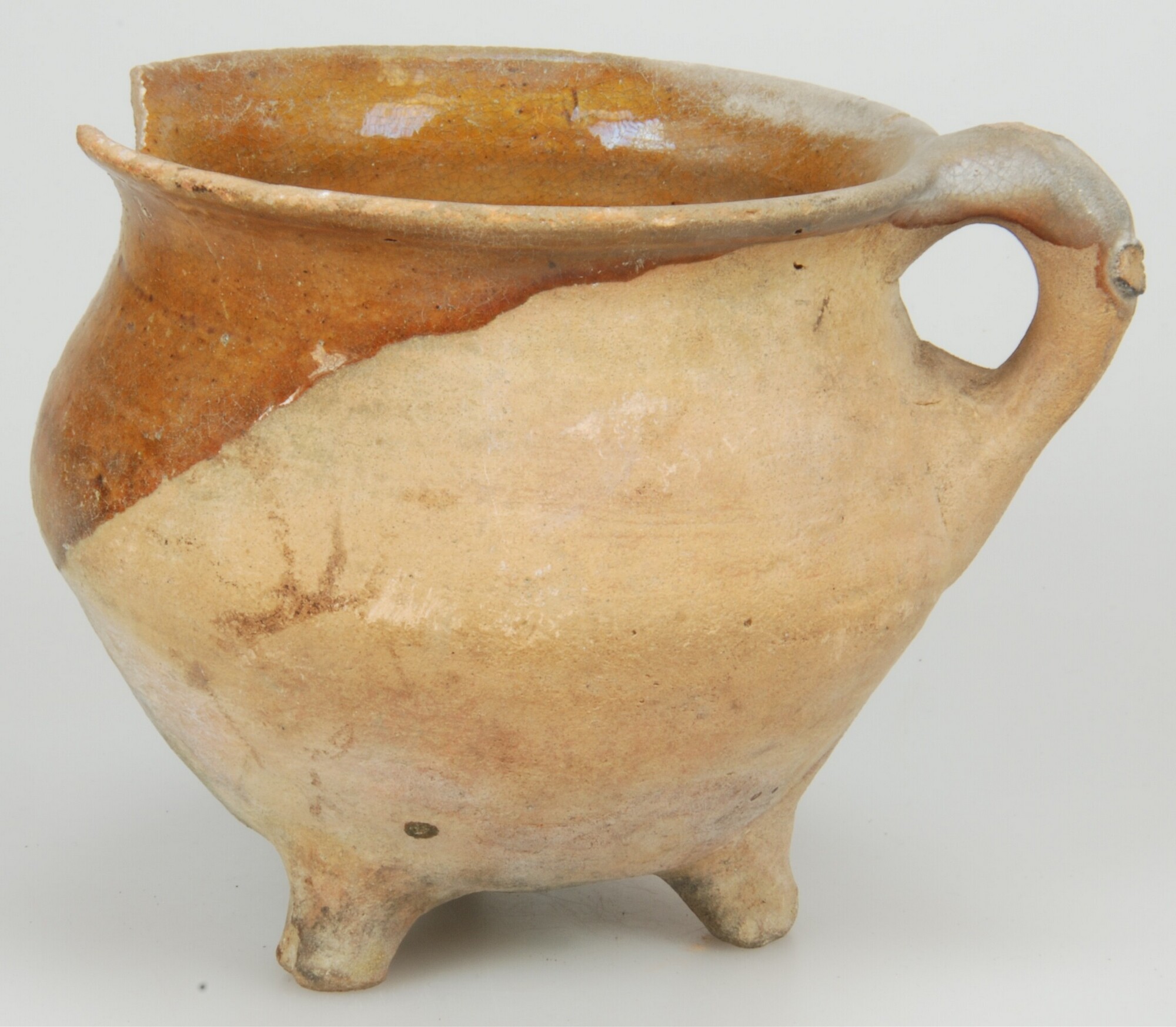 Grape; r-gra-33(?); roodbakkend; loodglazuur: binnenzijde volledig geglazuurd en buitenzijde spaarzaam; scherpe buikknik en iets uitgebogen rand; driepoot; één verticaal worstoor;