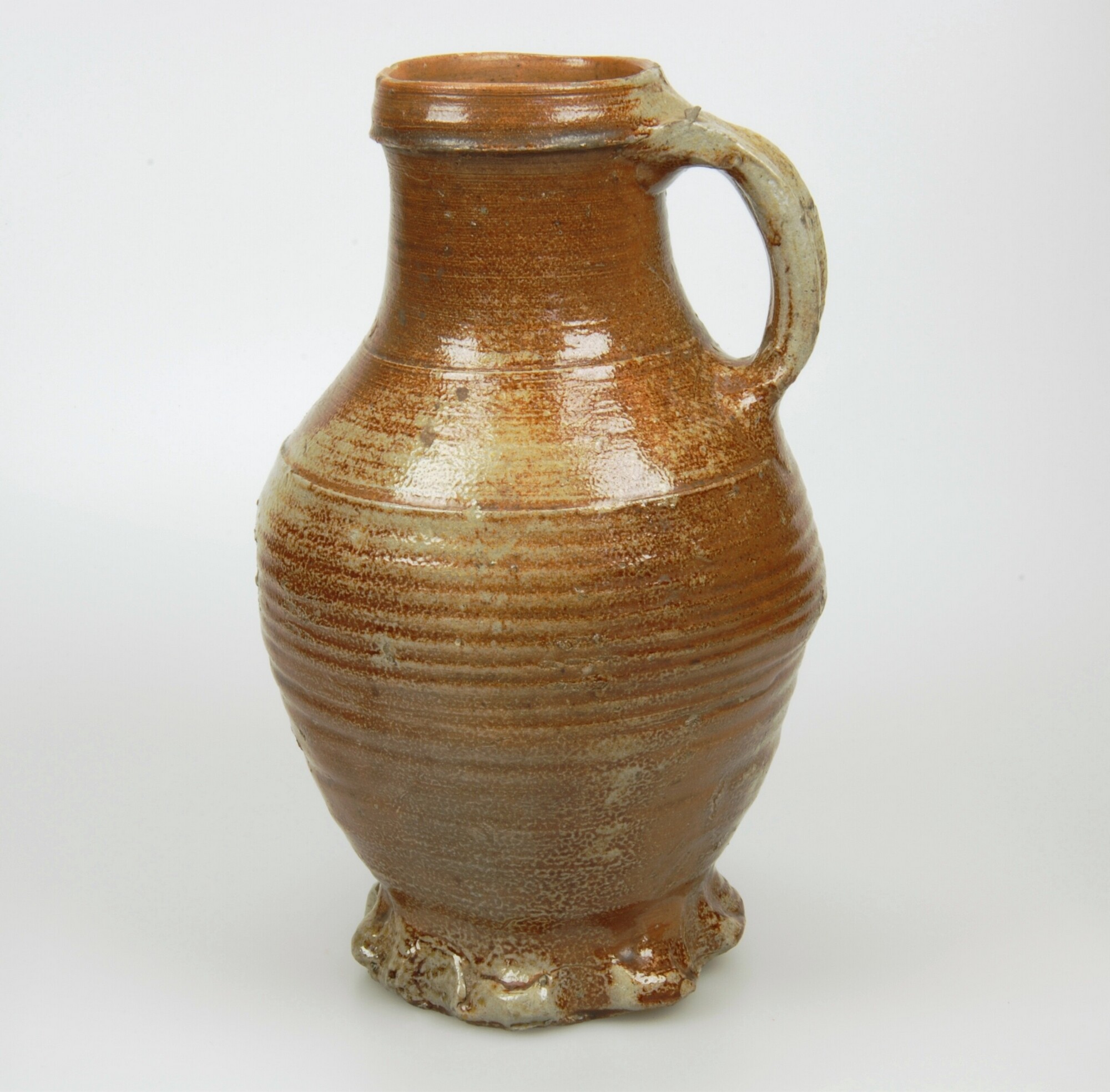 Kan; s2-kan-23; steengoed; geknepen standring; één lintoor; ijzerengobe, zoutglazuur; manchetrand; draairillen; herkomst: Langerwehe