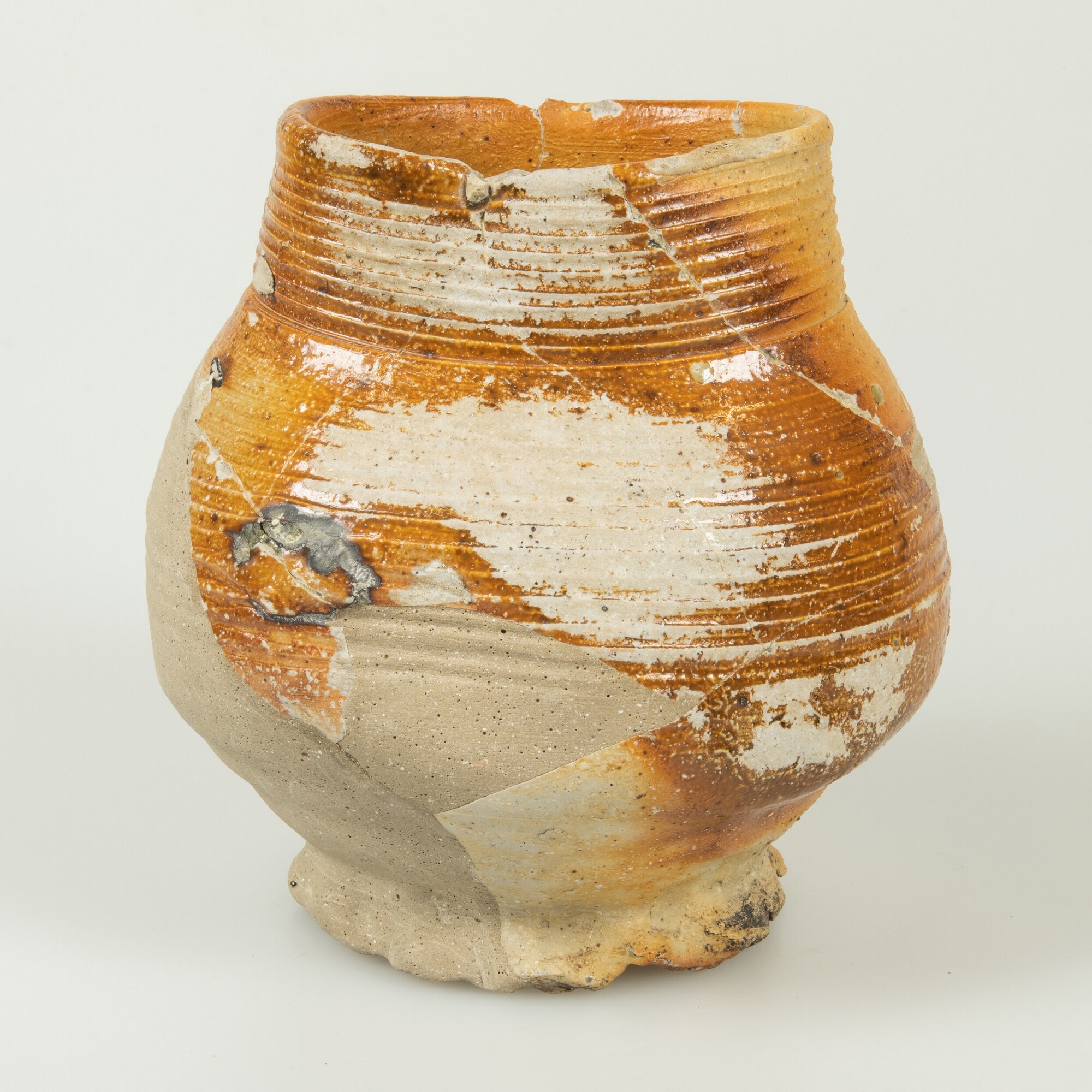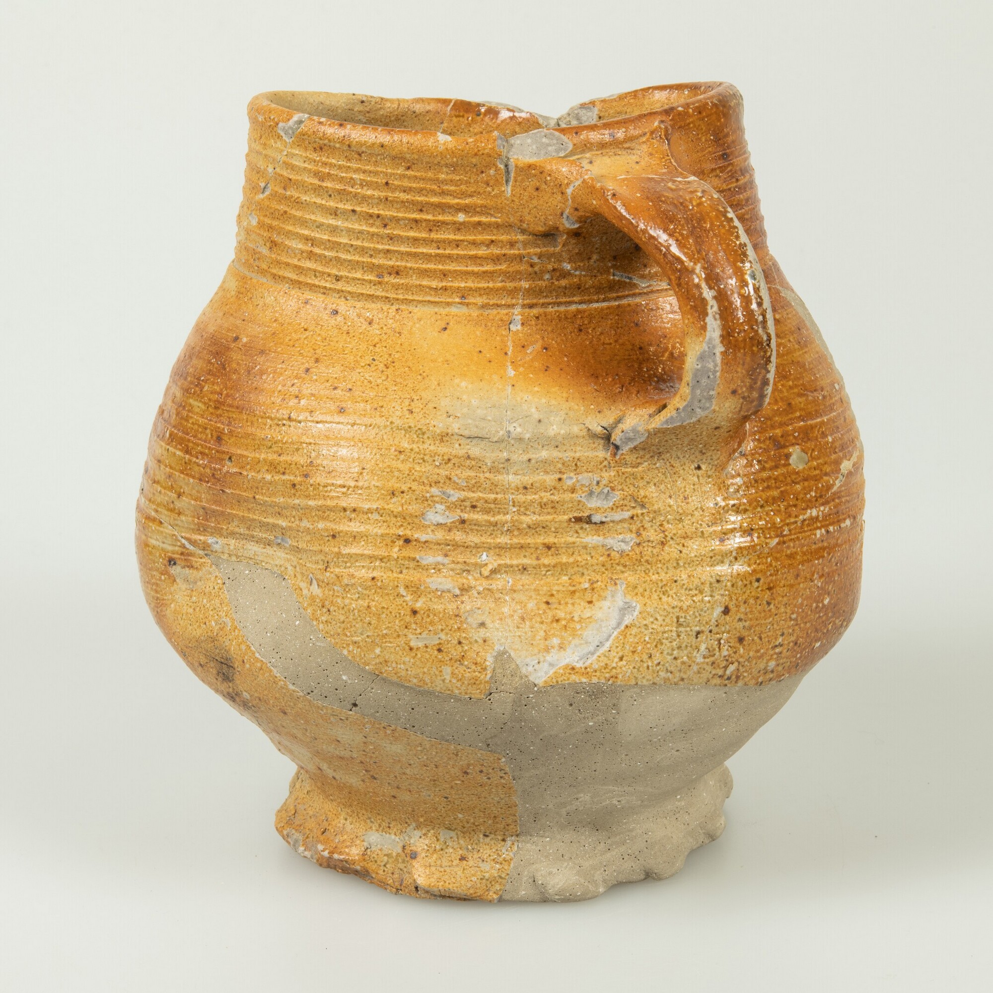 Kan; s1-kan-13; kan met afgeronde buikknik op halve hoogte en cilindrische hals met rechte rand, standring, verticaal lintoor; steengoed; oranje asblos en asglazuur; misbaksel; herkomst: Siegburg, Rijnland