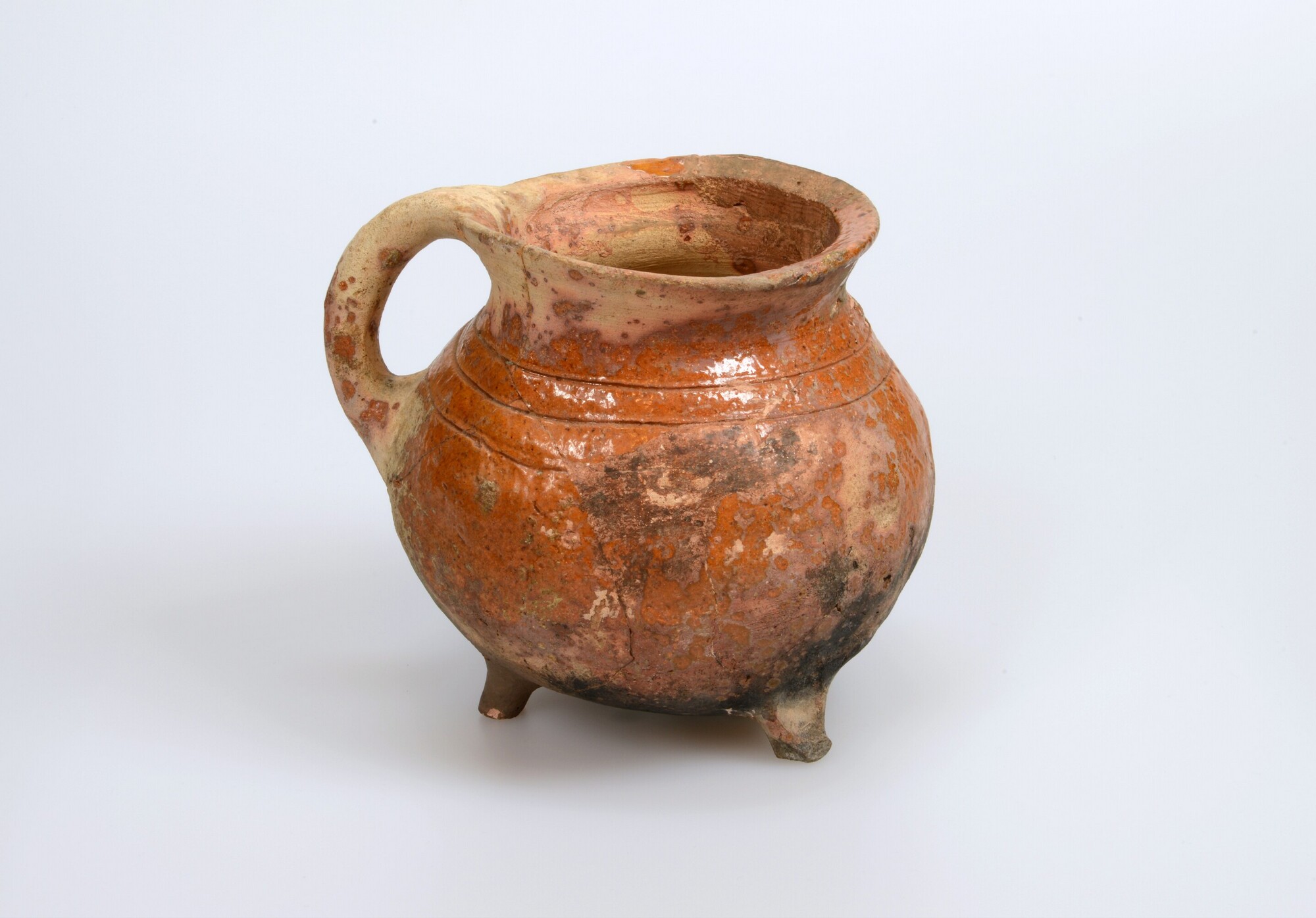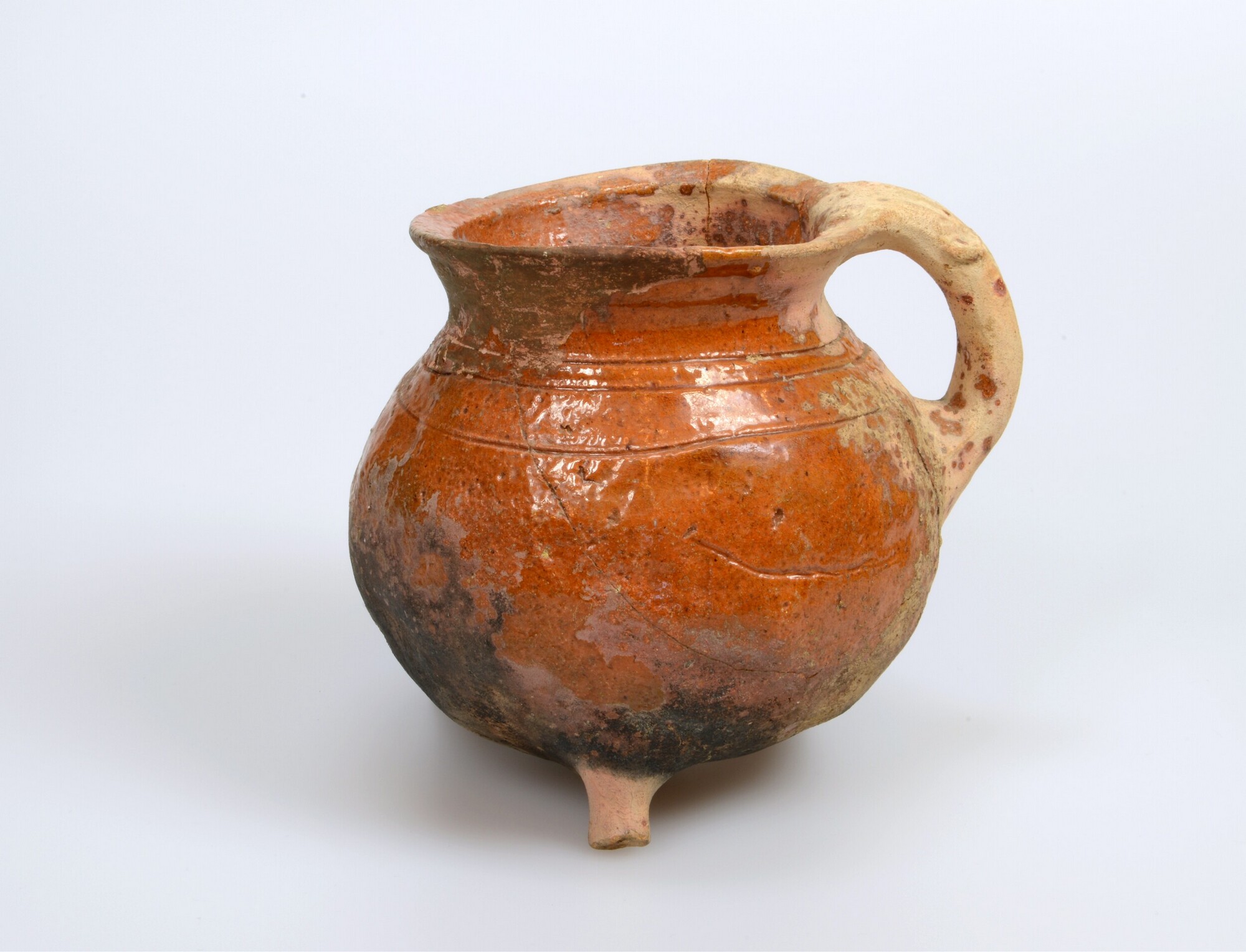 Grape; r-gra-; roodbakkend; loodglazuur, binnenzijde en buitenzijde geglazuurd; drie draairingen op schouder; driepoot; één vertikaal worstoor; roetsporen