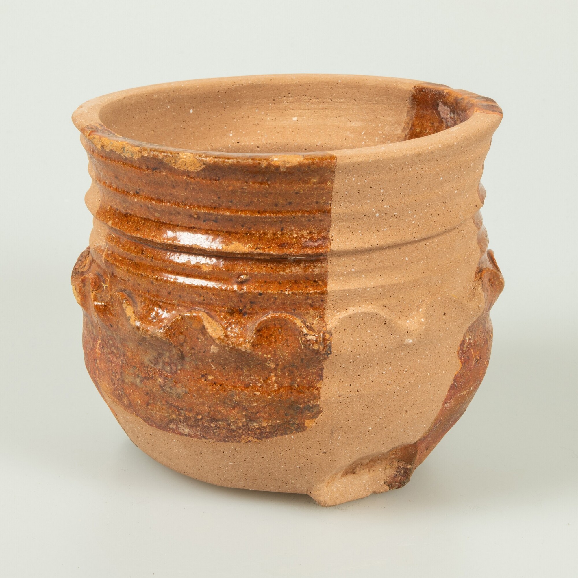 Kop; r-kop-24; bolle diepe kop, ribbel onderlangs rand, kraagrand met dekselgeul, drie lobvoeten; roodbakkend aardewerk; spaarzaam loodglazuur; golfband met vingerindrukken op buik; herkomst: West-Nederland