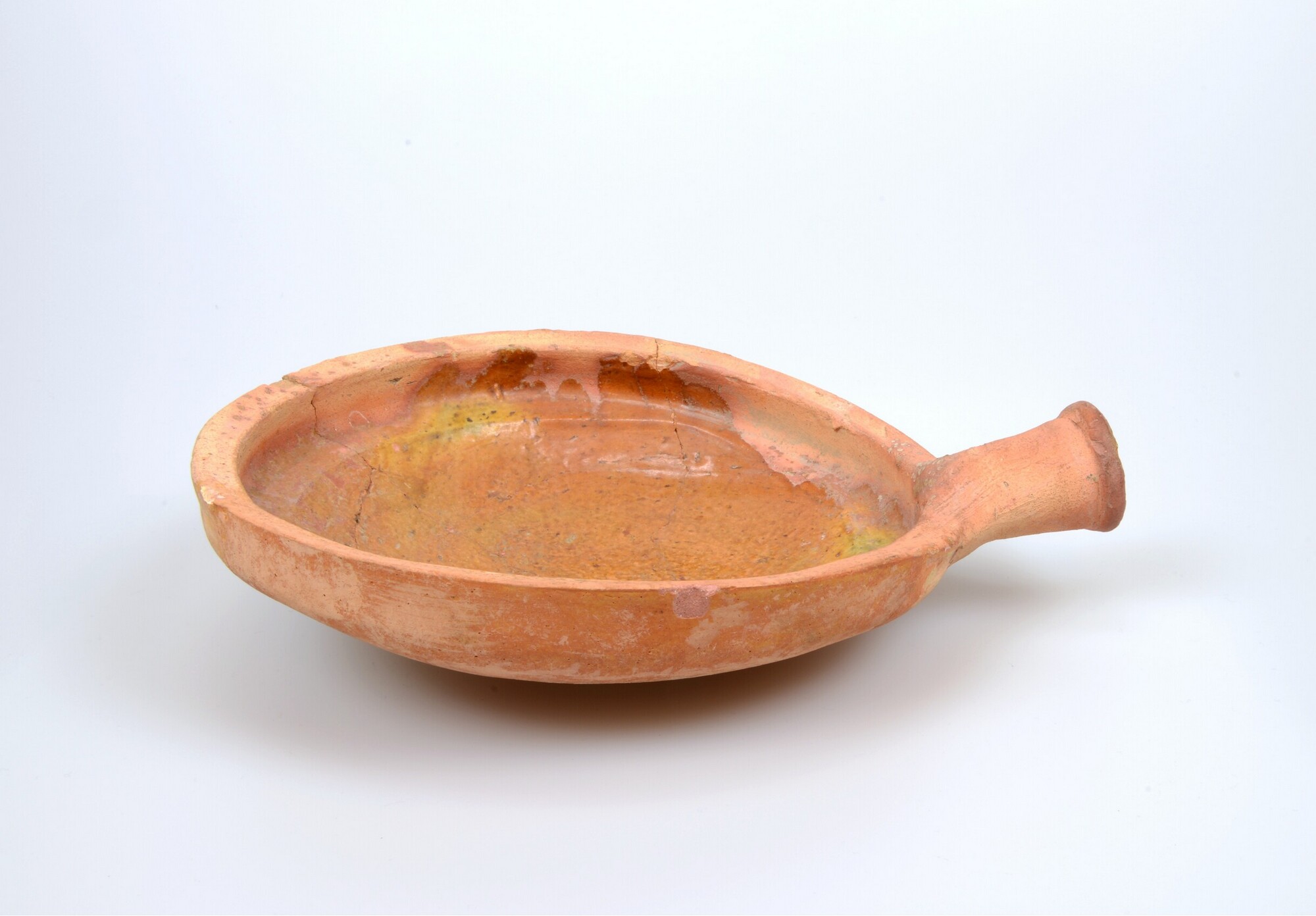 Bakpan; r-bak-45; bakpan met uitstaande zijwand en verdikte rand met lip aan de binnenzijde, holle steel; roodbakkend aardewerk; spaarzaam loodglazuur; herkomst: West-Nederland; vondstjaar: 1960