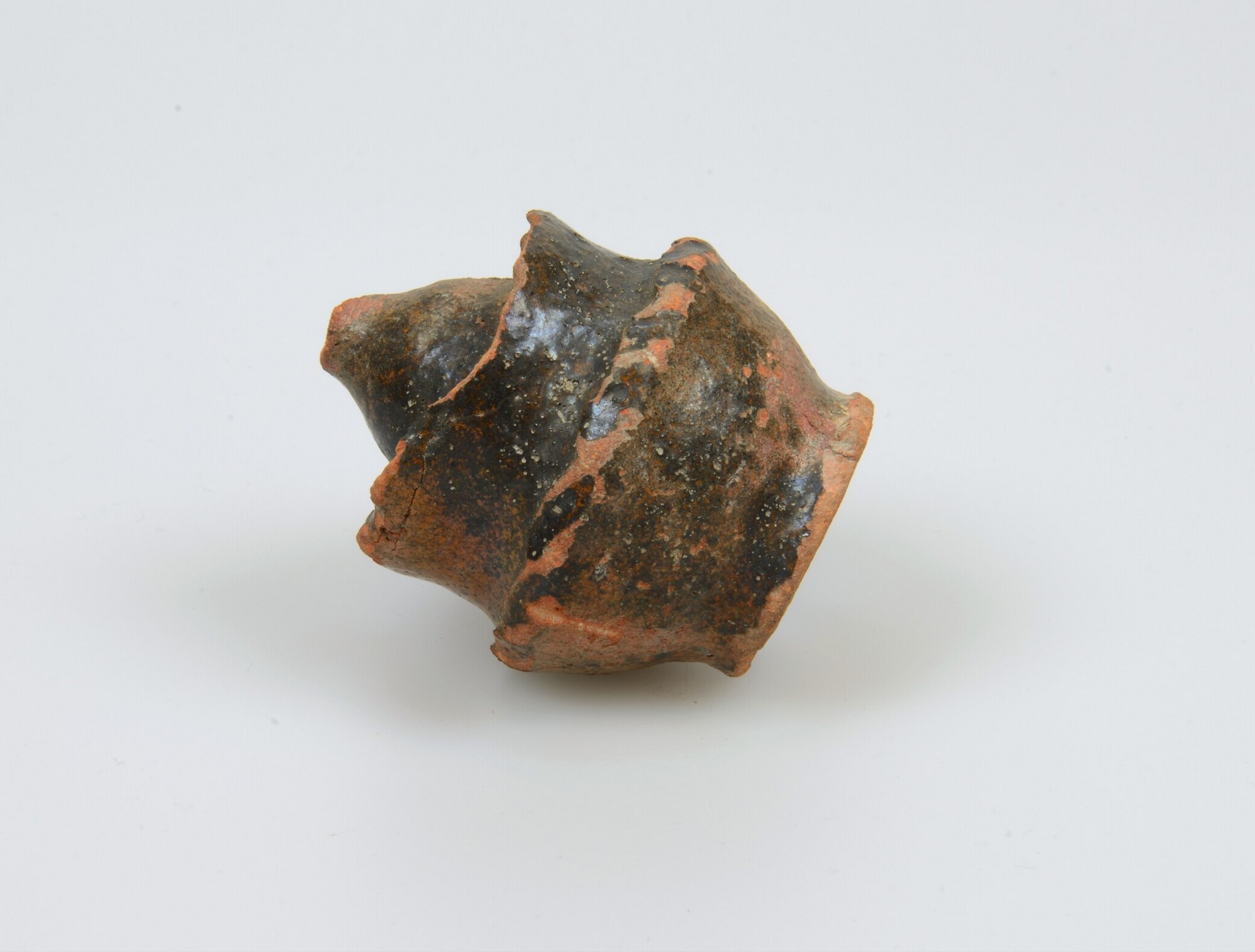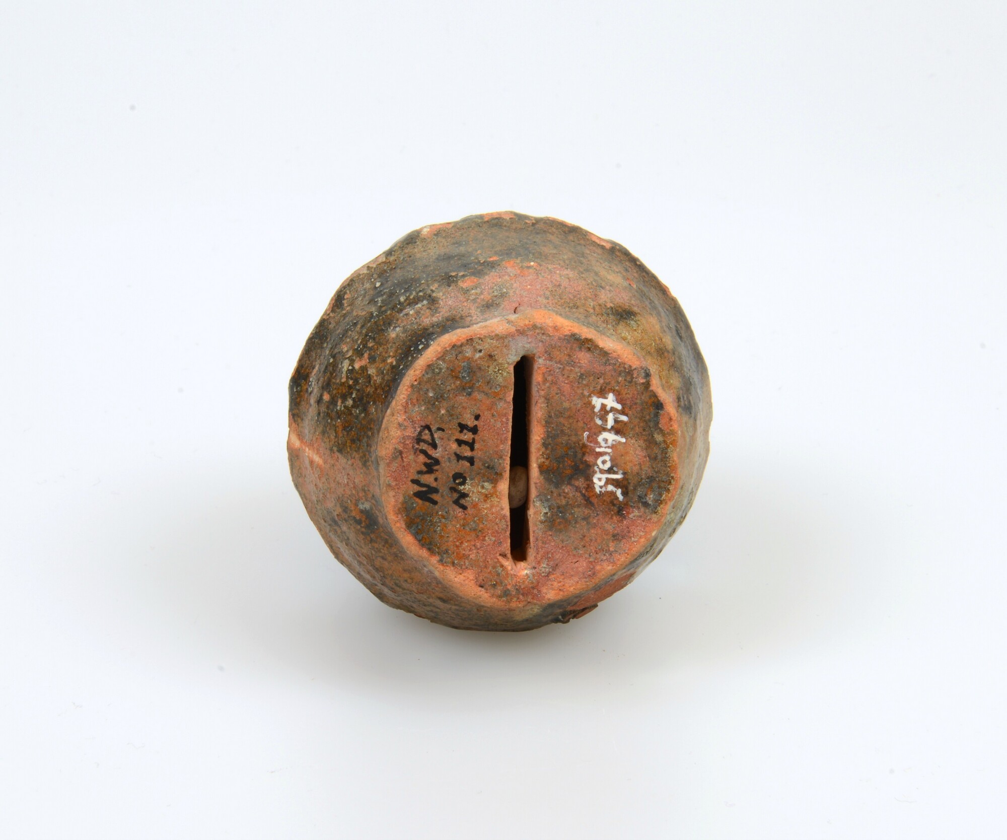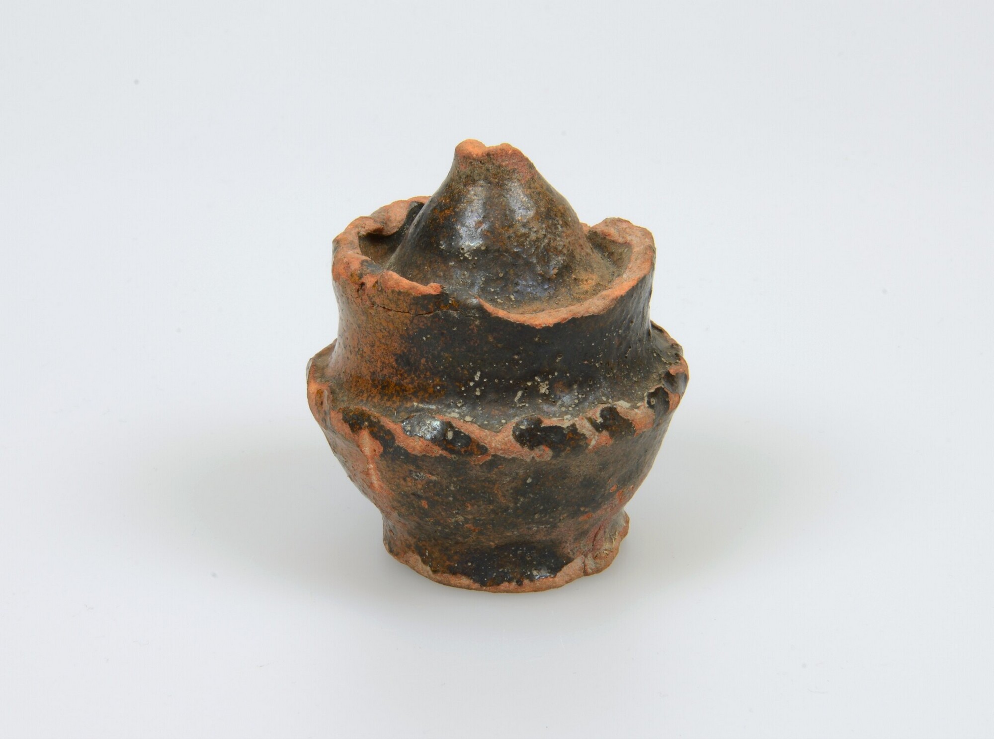 Spaarpot; r-spa; bolle spaarpot met kraagrand en knopvormige bovenzijde, standvoet, gleuf in de bodem; roodbakkend aardewerk; loodglazuur; herkomst: Nederland