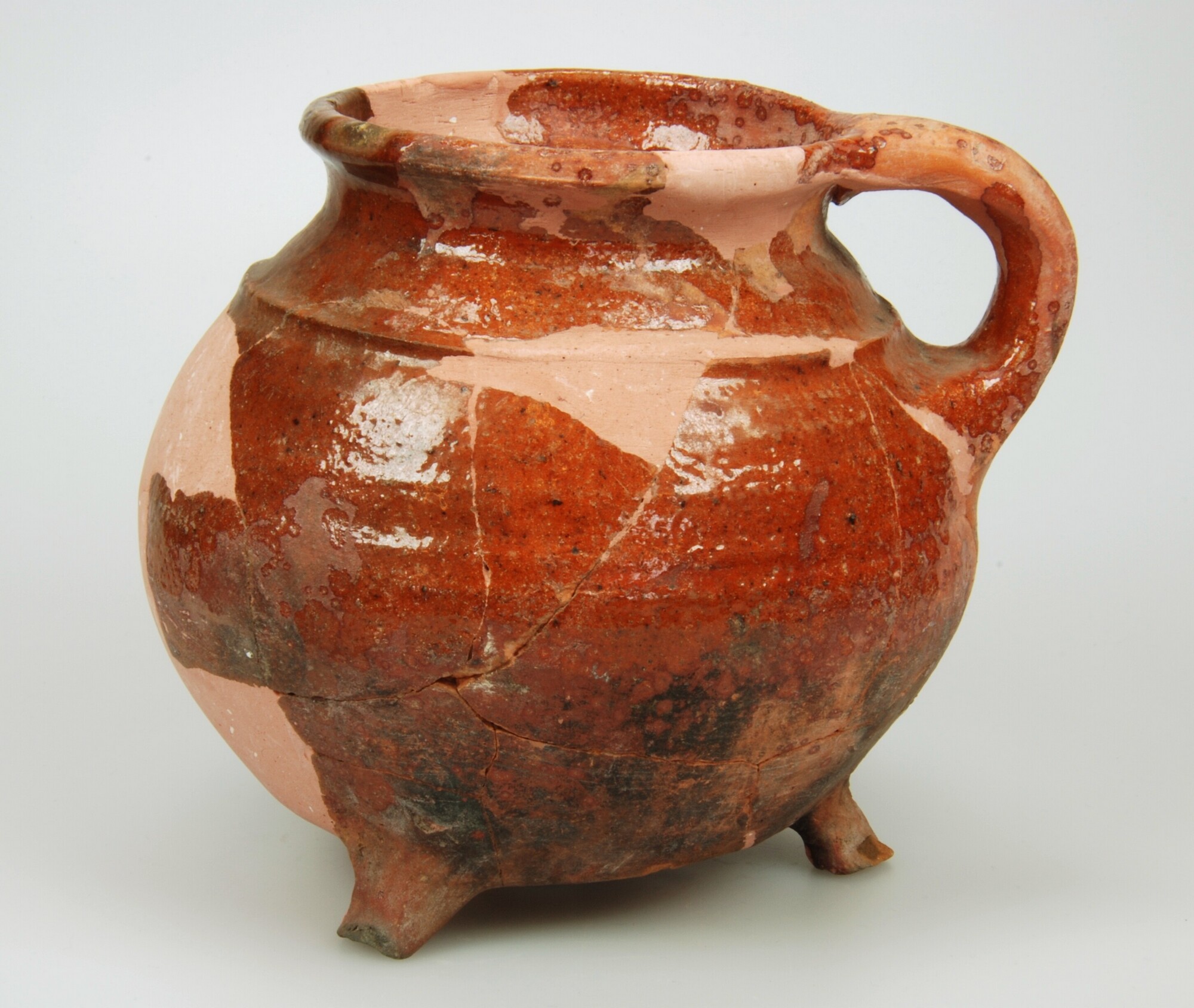 Grape; r-gra-94; roodbakkend; loodglazuur, binnenzijde en buitenzijde geglazuurd; groeven; draairibbels; driepoot; één samengeknepen verticaal worstoor