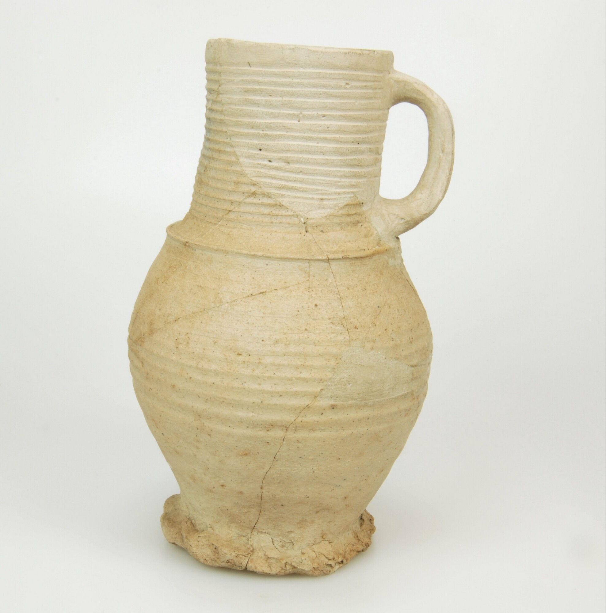 Kan; s1-kan-11; steengoed; standring geknepen; één verticaal lintoor; draairingen; herkomst: Siegburg; vondstjaar: 1961