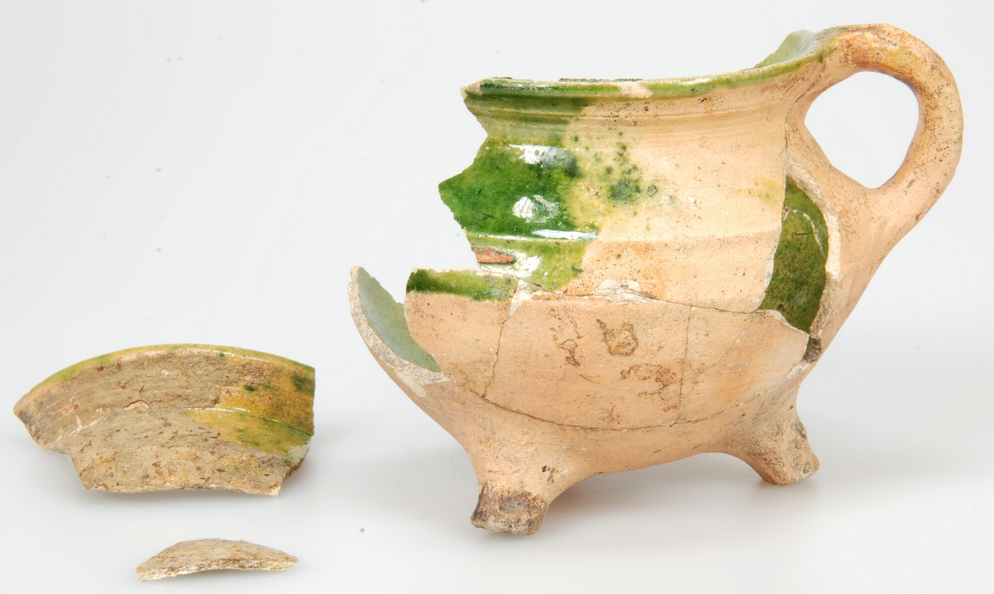 Grape; w-gra-12; grape met scherpe buikknik, ribbel op schouder en onverdikte rand; witbakkend aardewerk; inwendig loodglazuur met koperoxide, uitwendig loodglazuur met koperoxide; drie poten; één lintoor