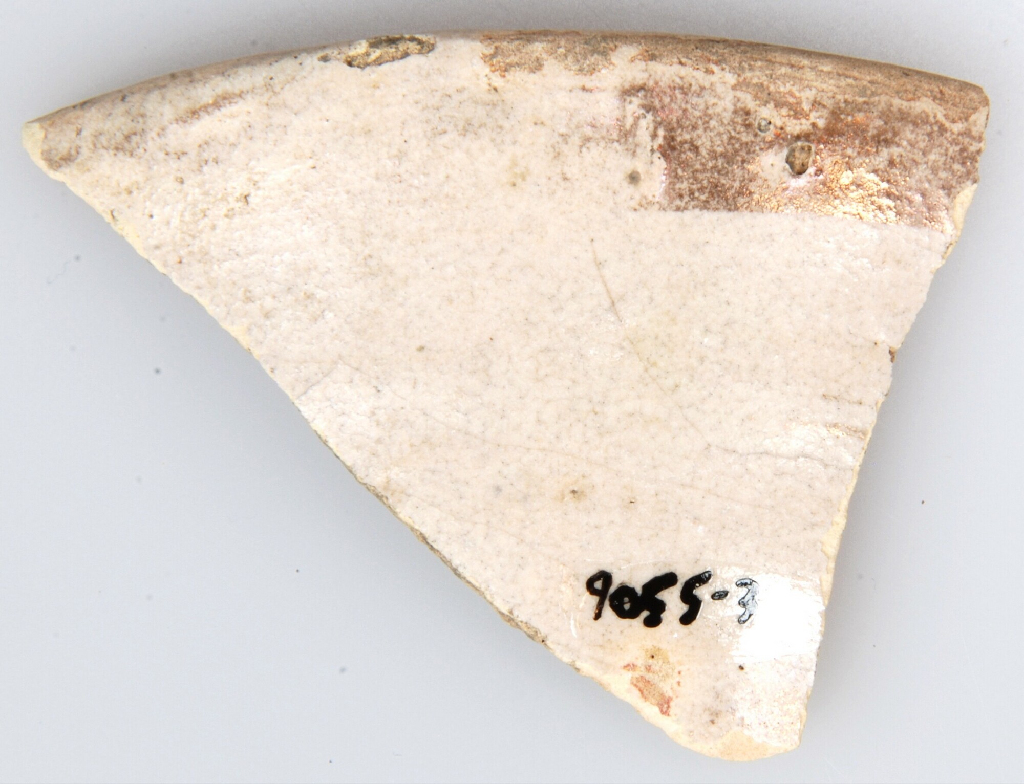 Kop (randfragment); sp-kop?; Spaans tinglazuuraardewerk (goudlustermajolica); panelen in goudluster; herkomst: Spanje