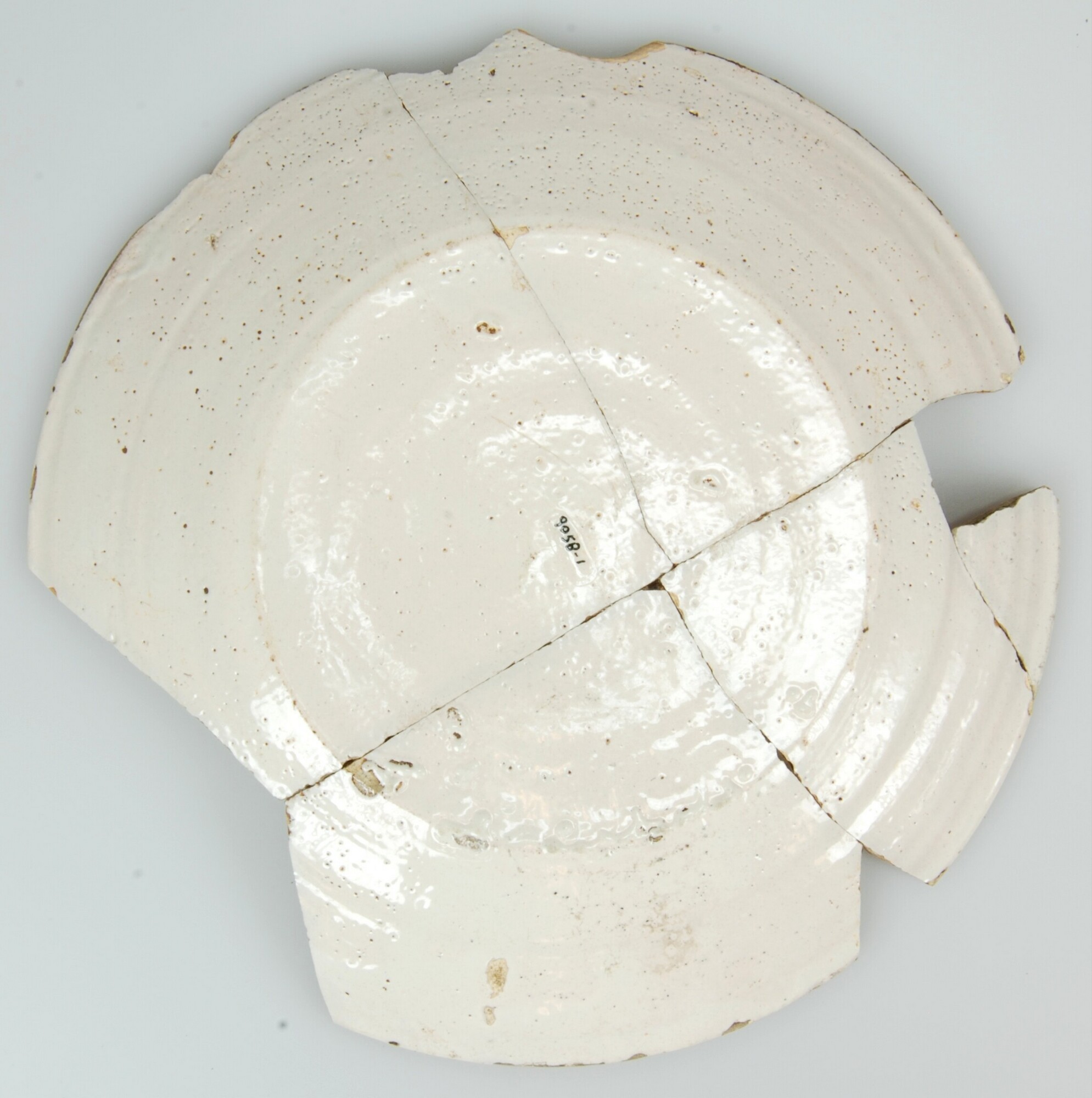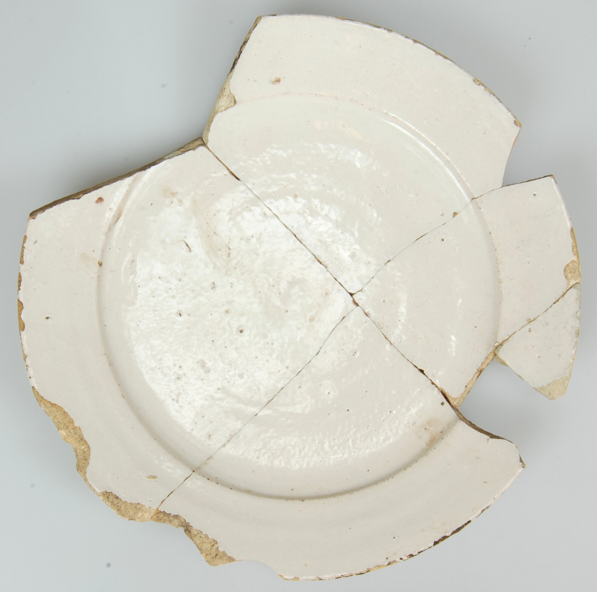 Bord; f-bor-3;bord met platte vlag; faience (Delfts wit); boven- en onderzijde tinglazuur; standvlak; herkomst: Delft
