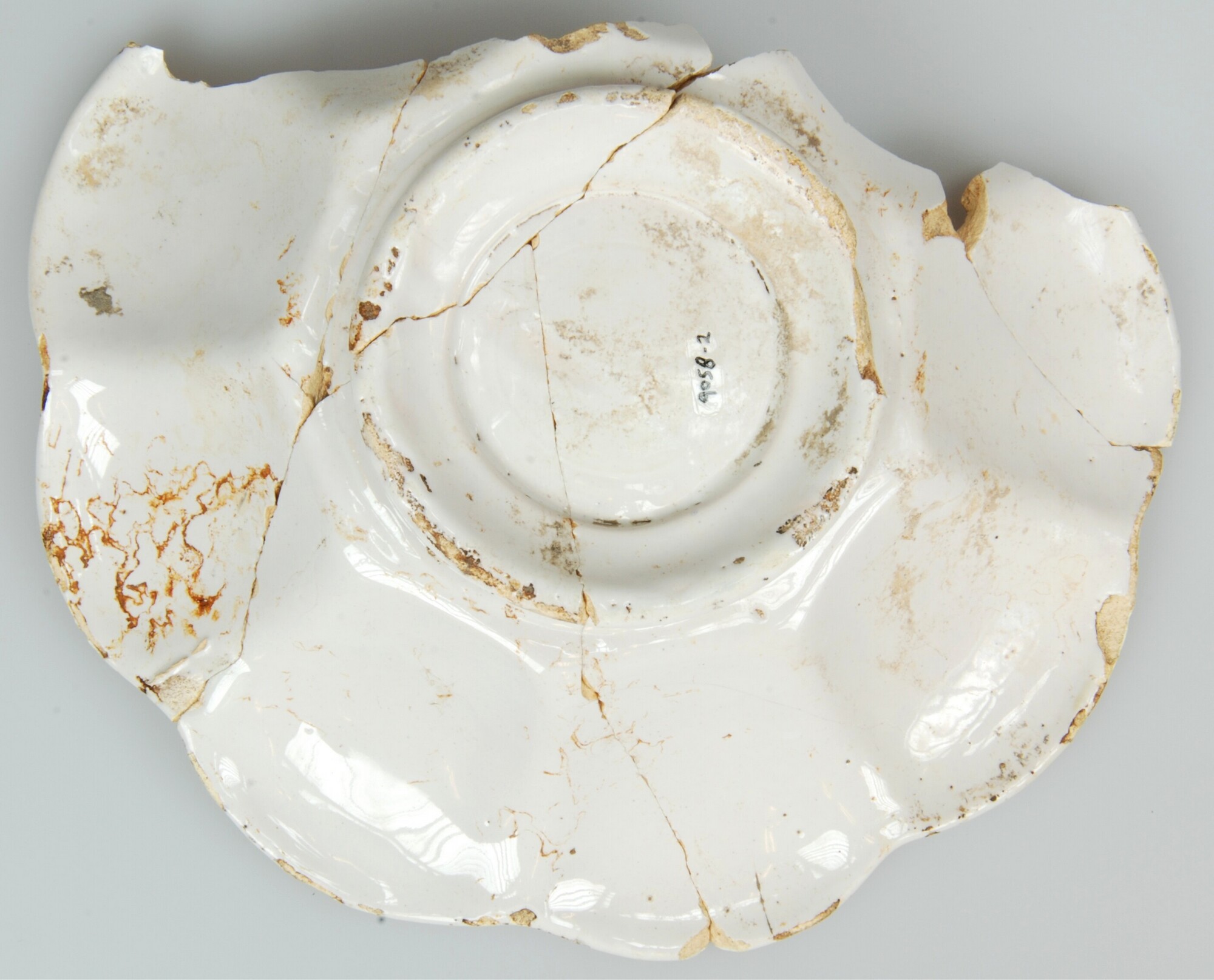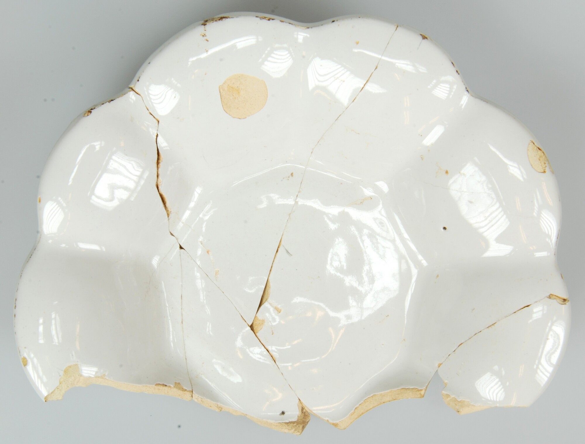 Plooischotel; f-plo-3; faience (Delfs wit); boven- en onderzijde tinglazuur; geheel wit; standvoet; herkomst: Delft