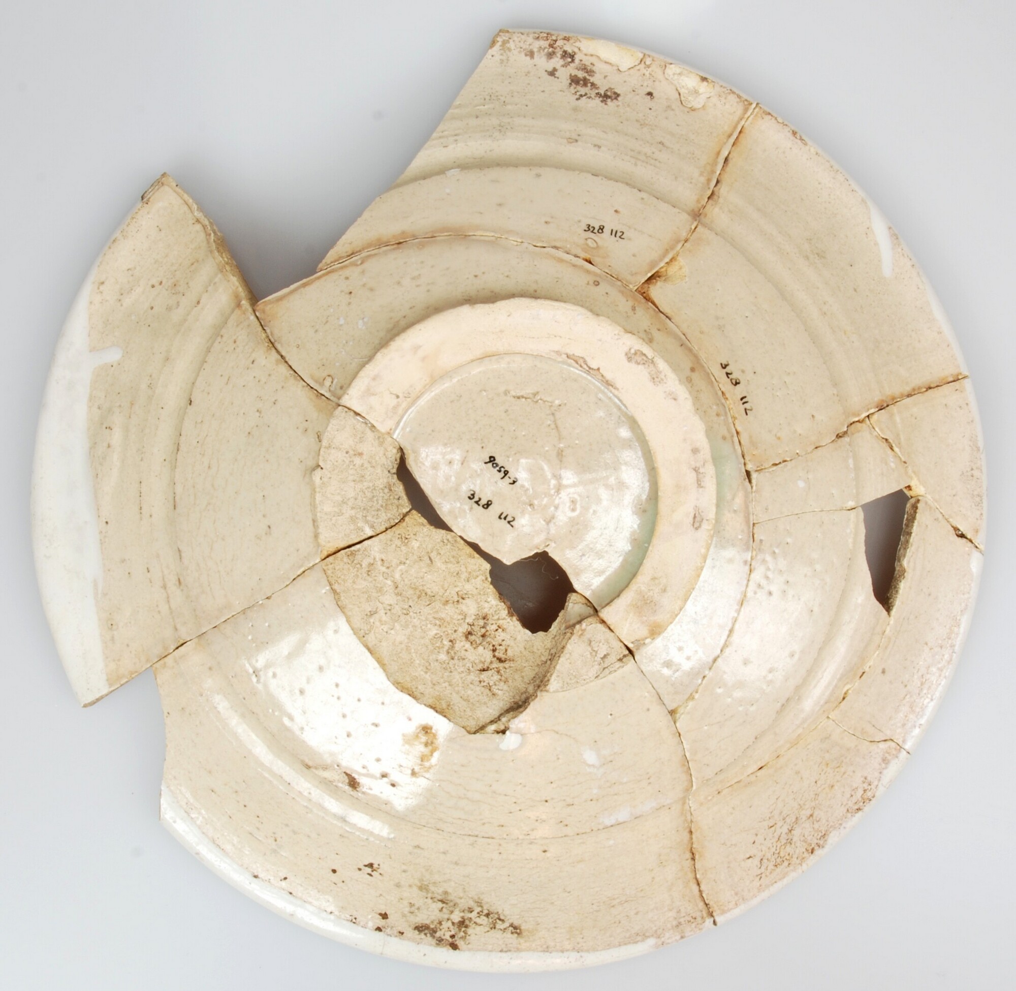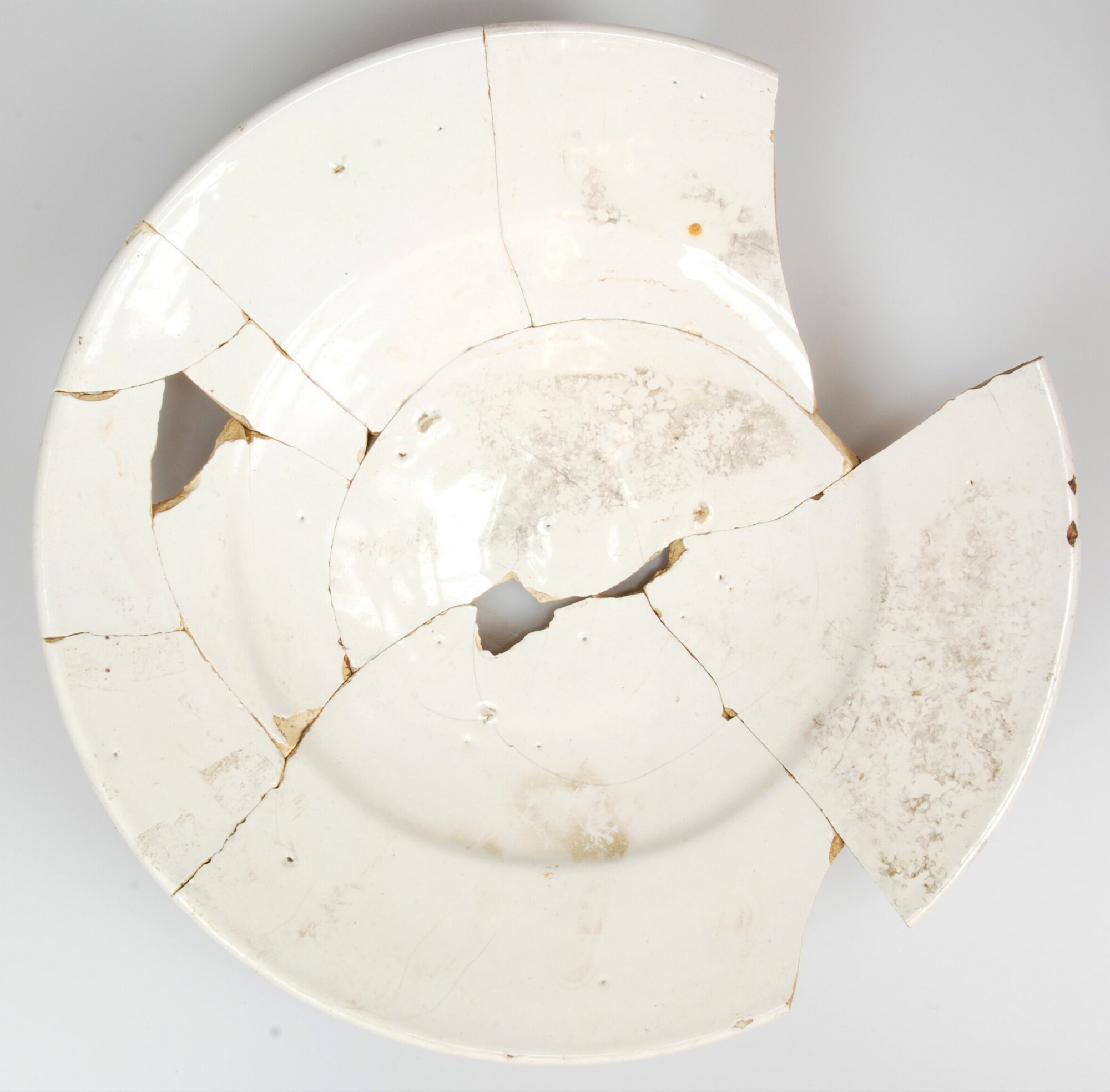 Bord; m-bor-1; bord met platte vlag; majolica; bovenzijde tinglazuur, onderzijde loodglazuur ; geheel wit; standring; herkomst: Friesland