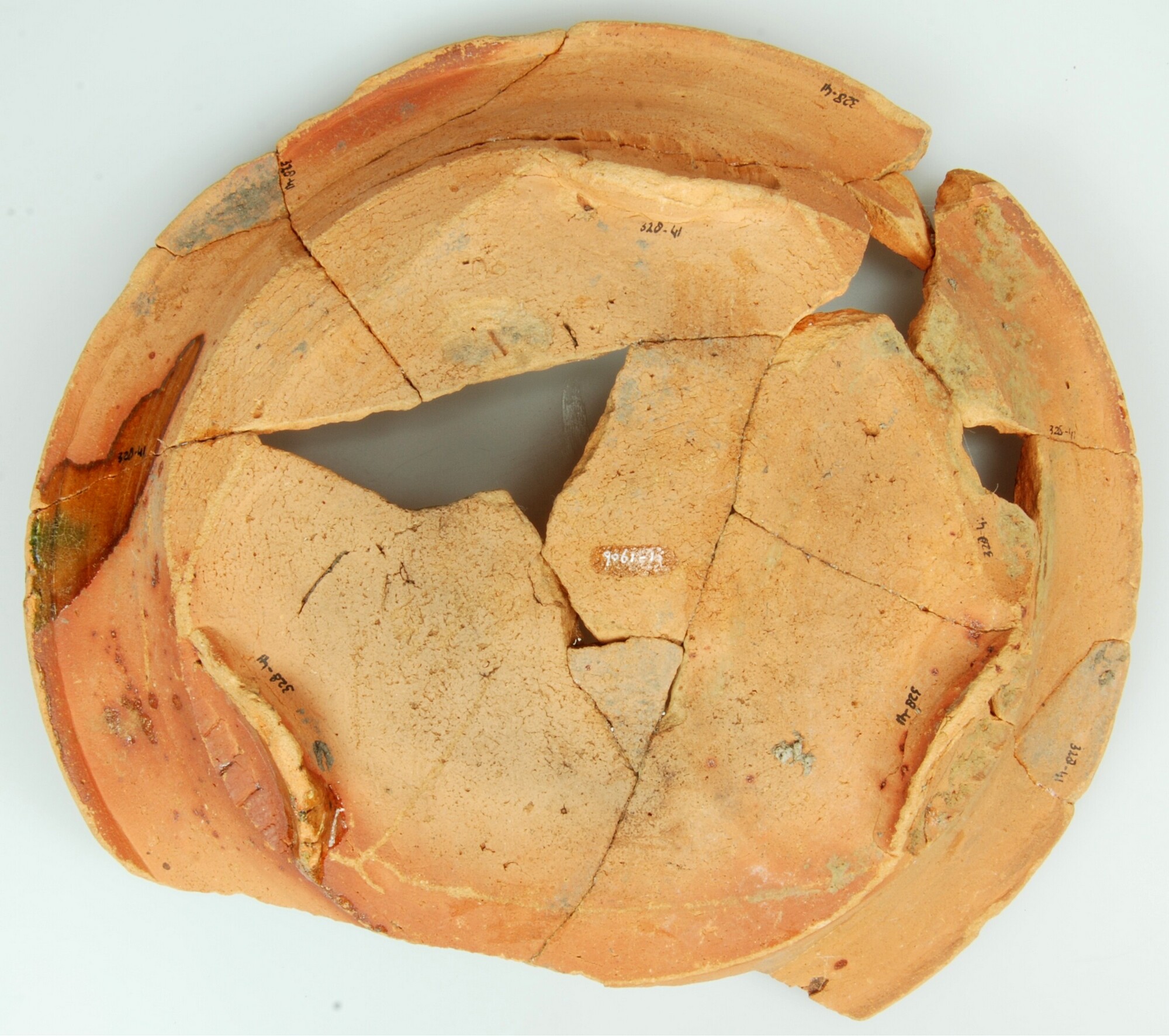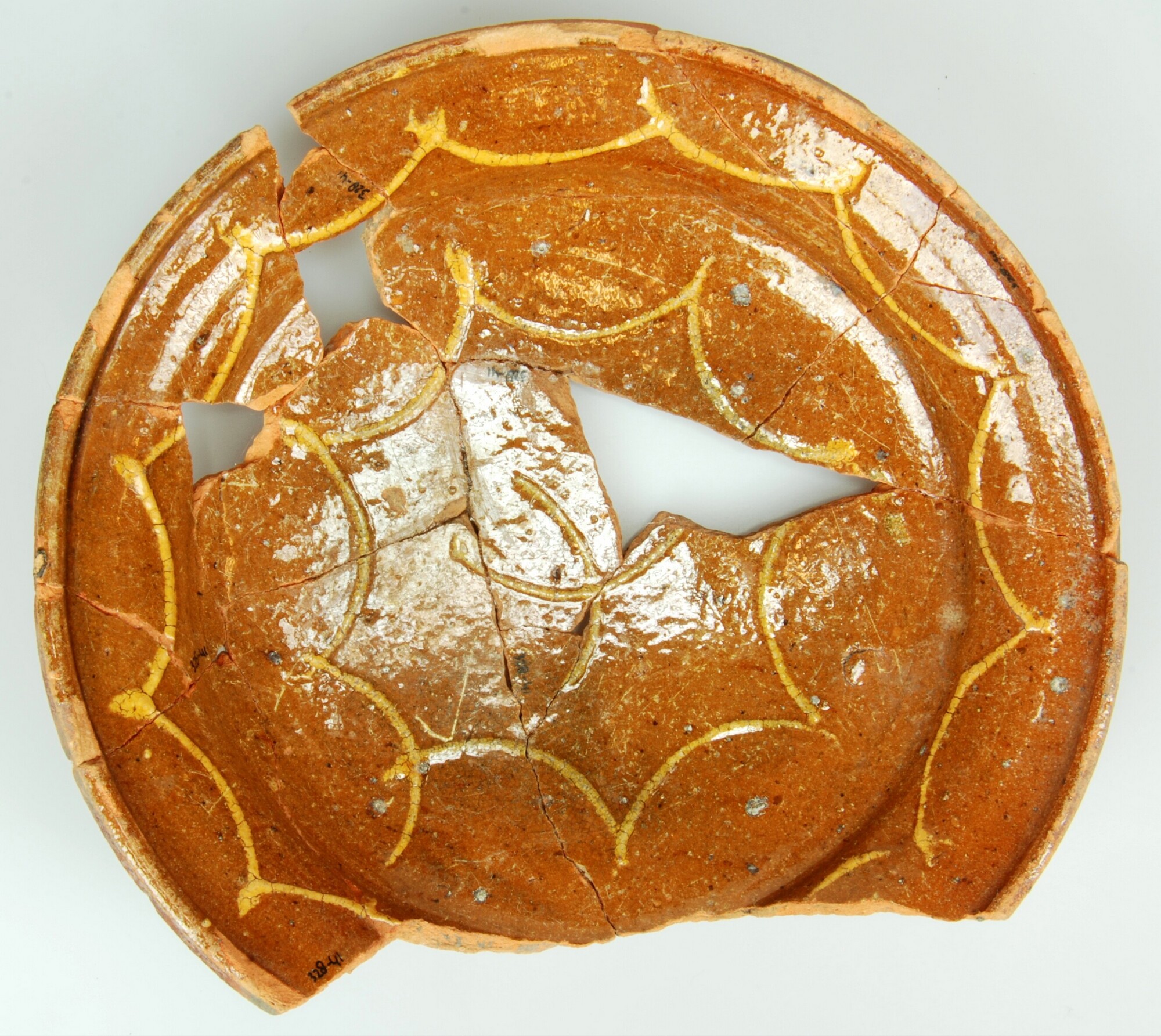 Bord; r-bor-1; bord met uitgebogen vlag; roodbakkend aardewerk; bovenzijde loodglazuur; slibversiering op spiegel en vlag; drie standlobben