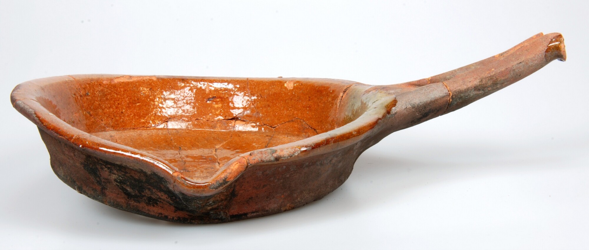 Steelpan; r-bak-2; bakpan met omgeslagen van buiten aangedrukte rand; roodbakkend aardewerk; inwendig loodglazuur; iets toegevouwen steel; schenklip op 90 graden t.o.v. steel; buitenzijde beroet
