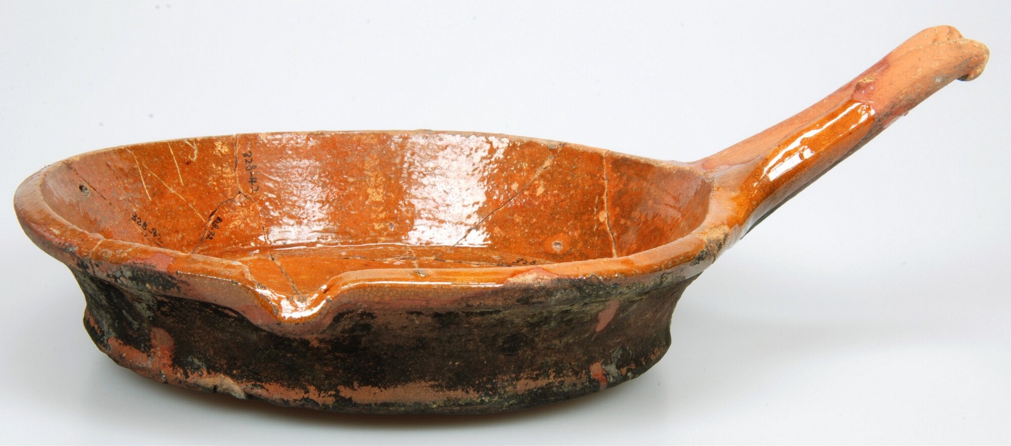 Steelpan; r-bak-8; bakpan met zijwand en kleine vierkante rand; roodbakkend aardewerk; inwendig loodglazuur; platte bodem; steel; schenklip 90 graden t.o.v. steel; buitenzijde beroet