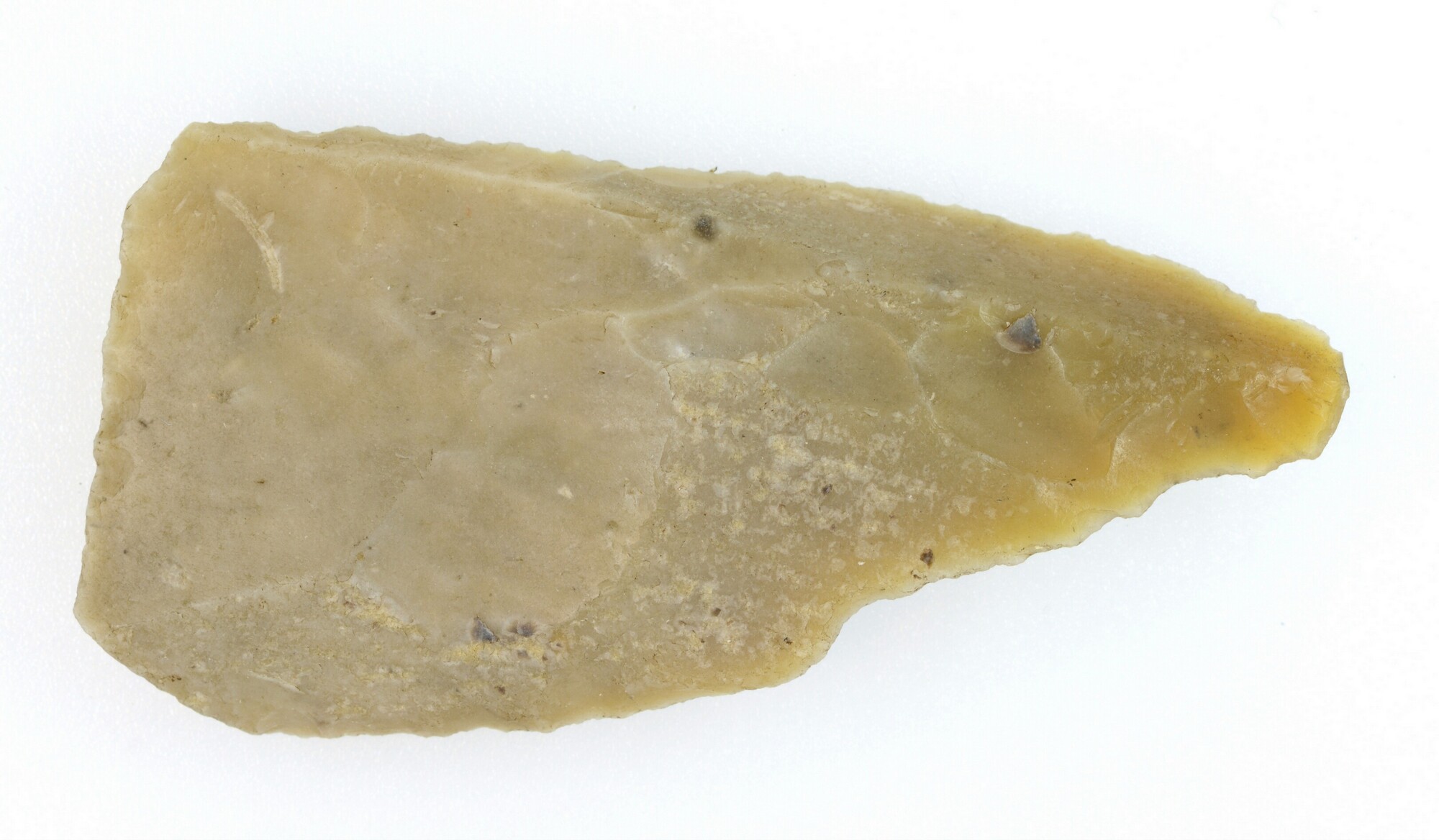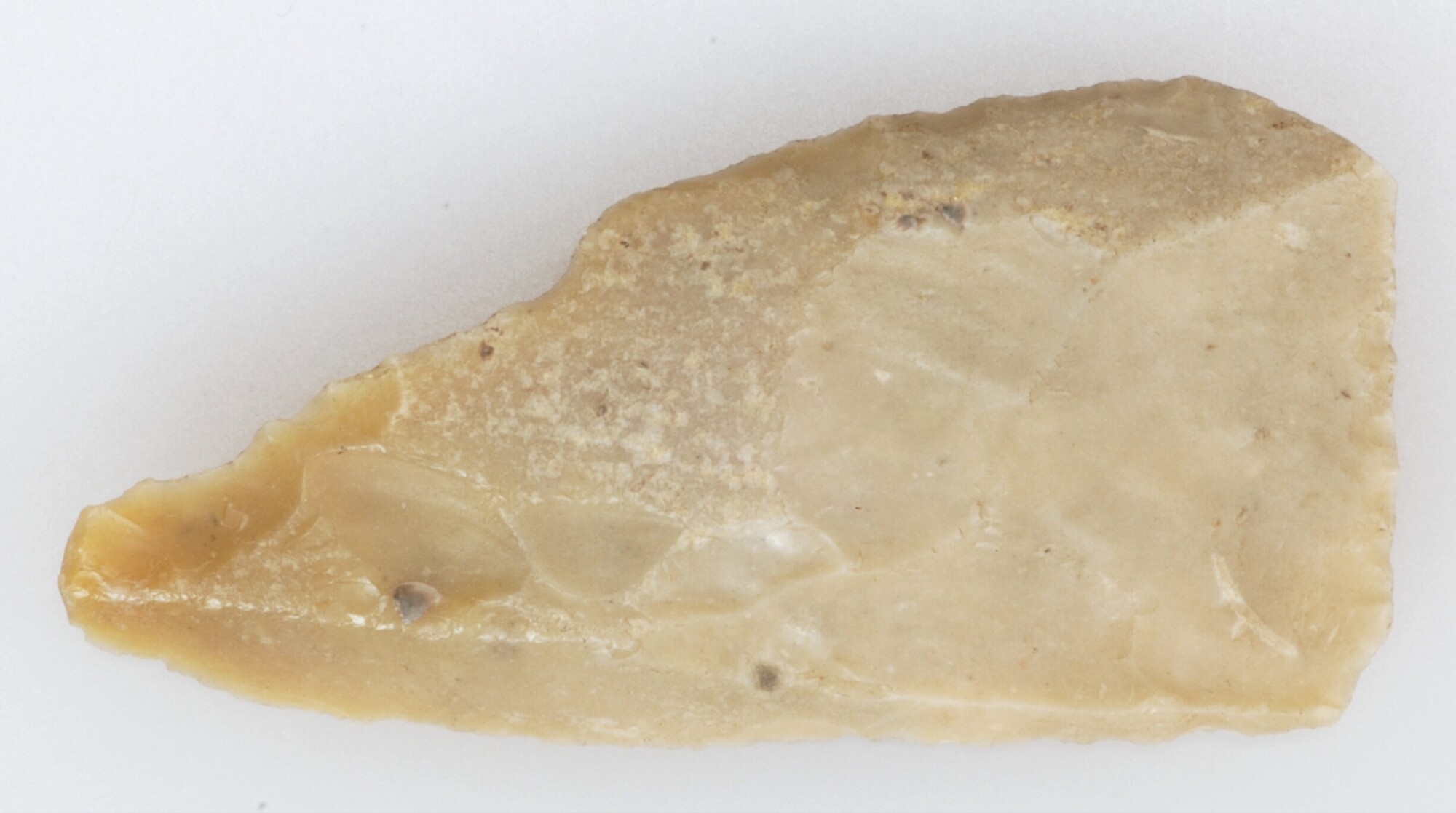 Geretoucheerde rechthoekige afslag met puntig uiteinde; vondstgegevens: 803/900.000; vondstjaar: 1960
