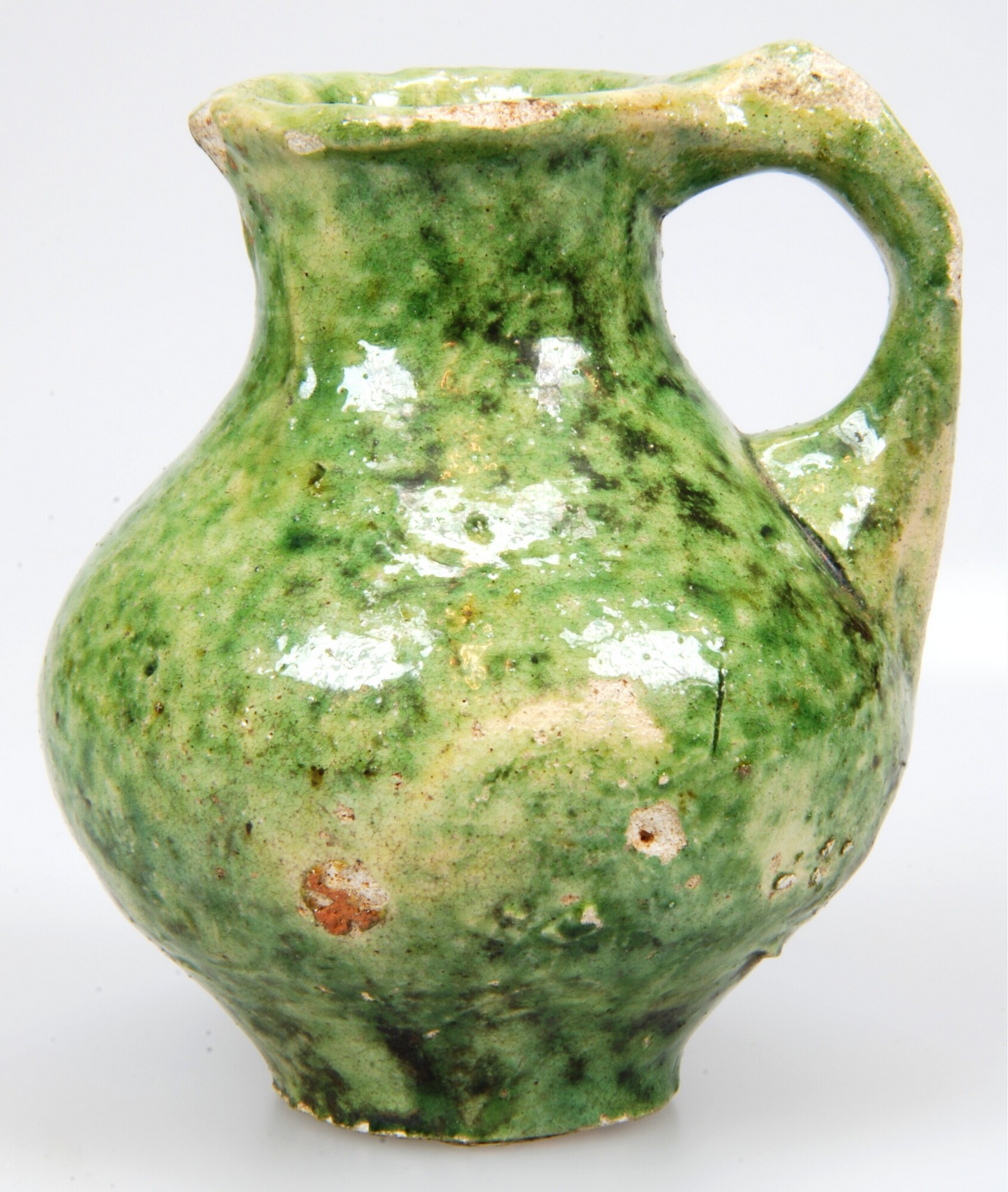 Kan; w-kan-24; kan met bolle buik en uitgebogen onverdikte rand, op standvlak; witbakkend aardewerk; volledig loodglazuur, uitwendig met koperoxide; standvlak; één toegeknepen oor