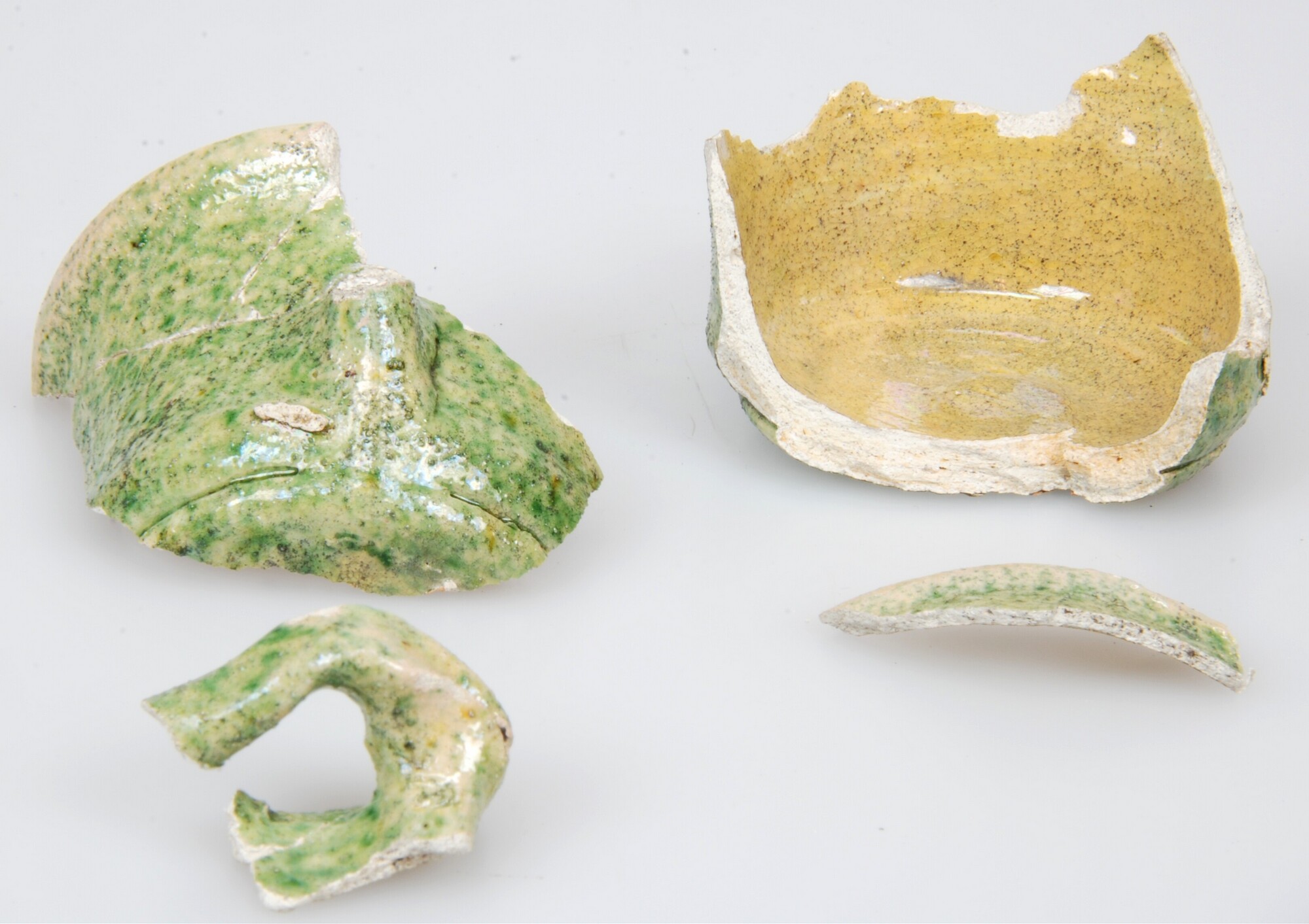 Kop; w-kop-3; witbakkend; inwendig loodglazuur, uitwendig loodglazuur/koperoxide; standvlak; toegeknepen oor