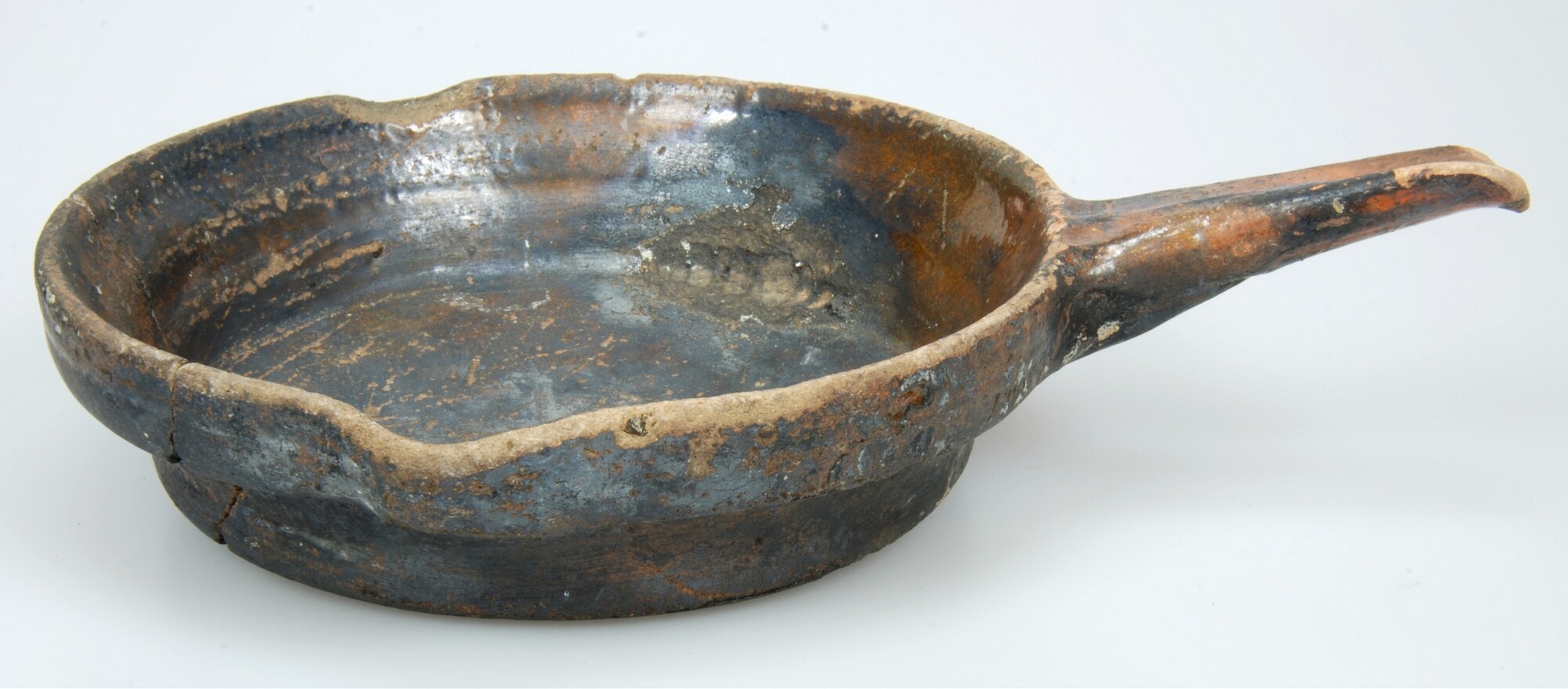 Steelpan; r-bak-6; bakpan met hoge kraagrand; roodbakkend aardewerk; in- en uitwendig loodglazuur; iets bolle bodem; één massieve steel; schenklip, beroet; gebruikssporen; herkomst: Bergen op Zoom