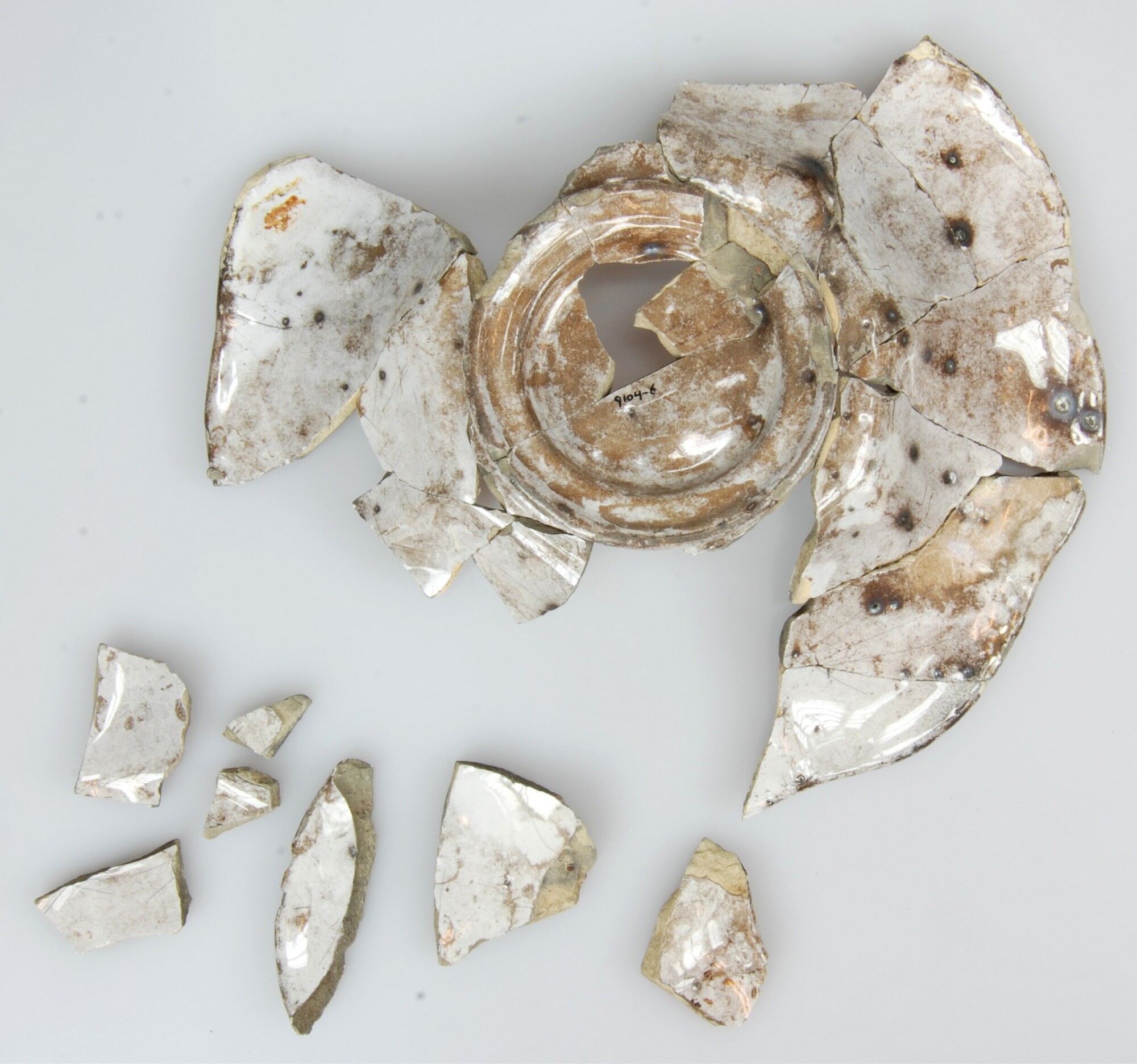 Plooischotel; f-plo-3; plooischotel met platte spiegel, knik spiegel-vlag en geplooide vlag, op standring; faience; tinglazuur; standring