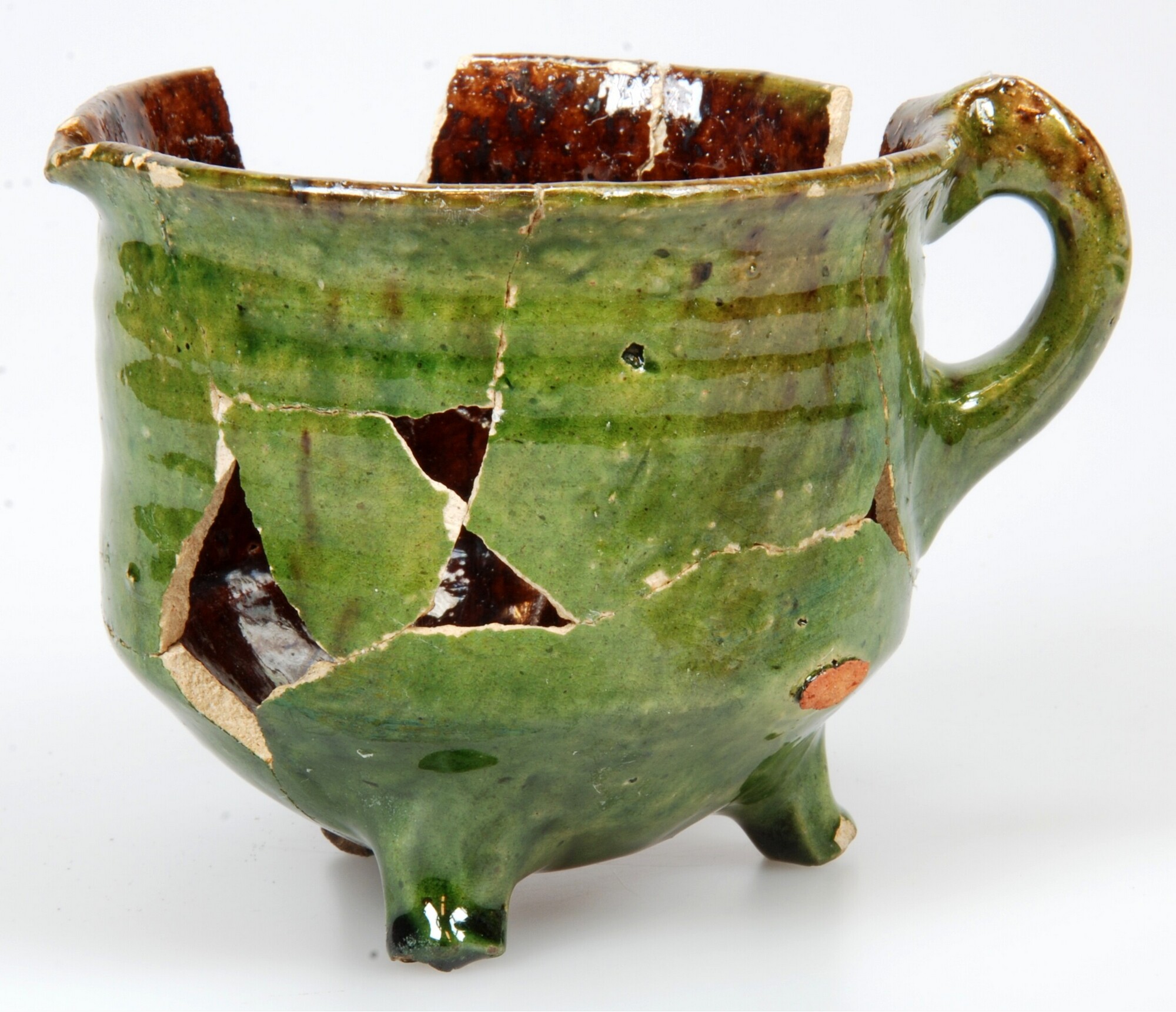 Grape; w-gra-22; grape met afgeronde buikknik, steile wand en rechte niet-verdikte rand; witbakkend aardewerk; loodglazuur, inwendig met mangaan, uitwendig met koperoxide; drie poten; één toegeknepen worstoor; schenklip