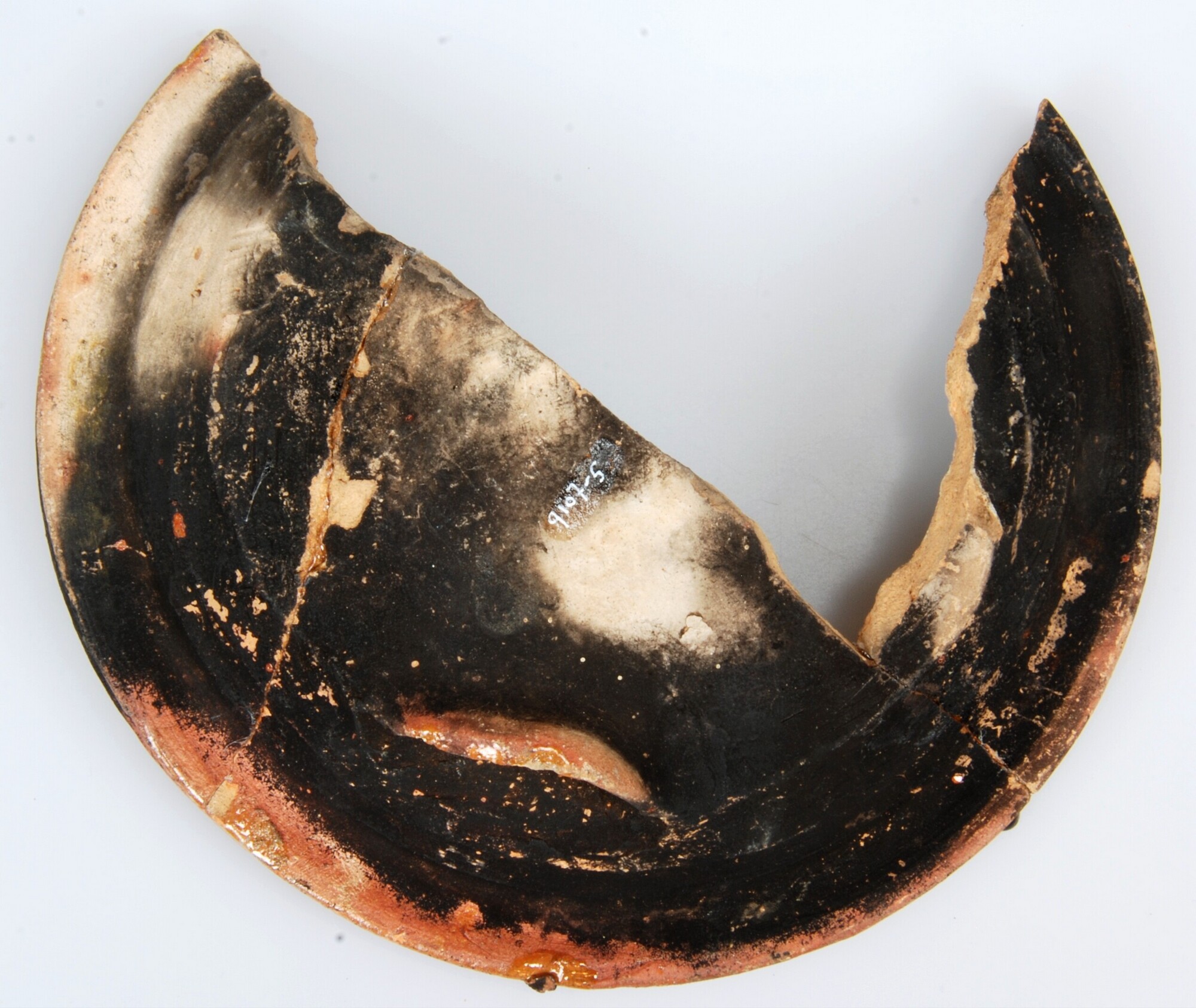 Bord; r-bor-6; bord met holle spiegel en korte platte vlag met van buiten aangedrukte rand, op standlobben; roodbakkend aardewerk; inwendig loodglazuur, op spiegel met koperoxide; drie standlobben; onderzijde sterk beroet