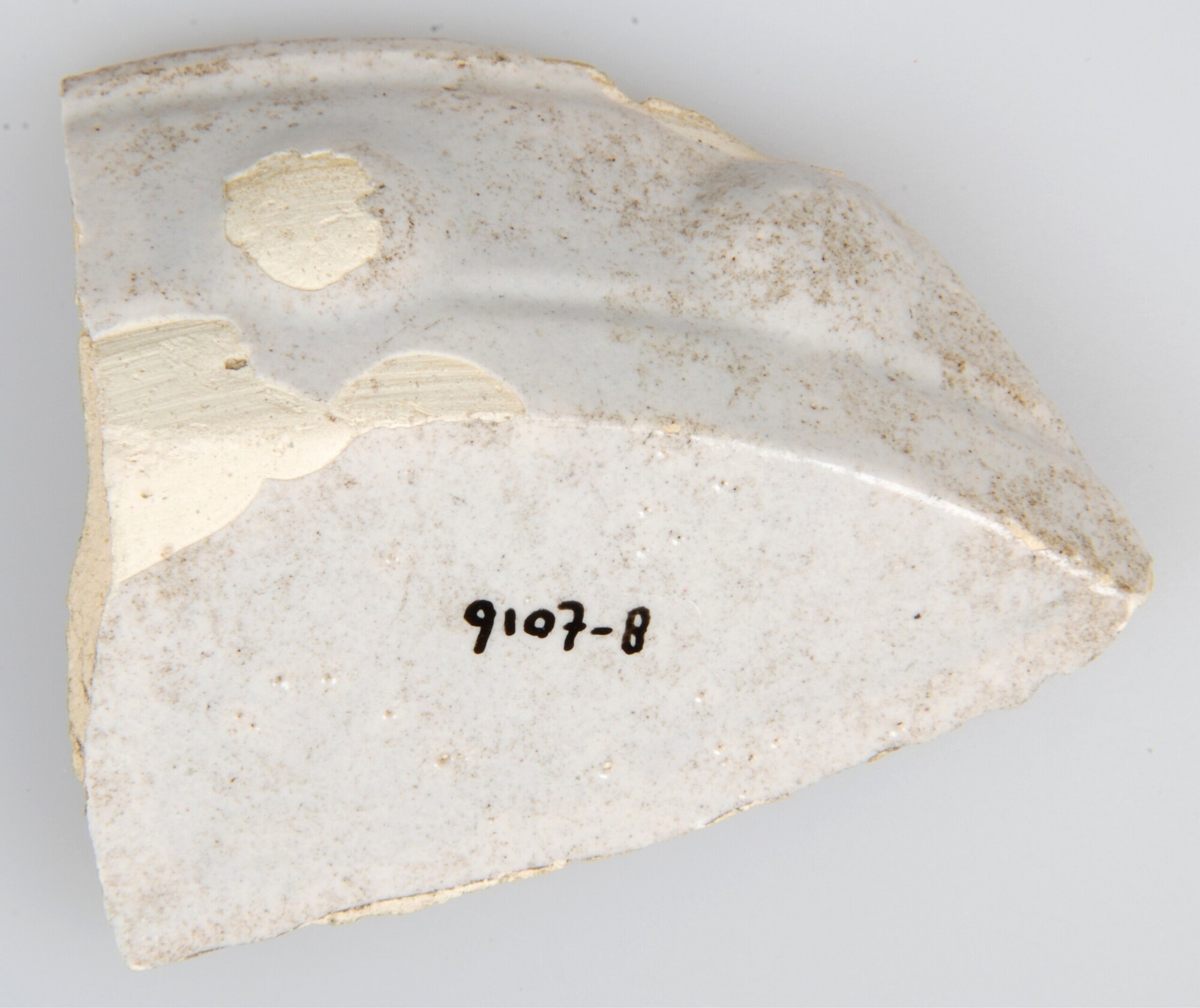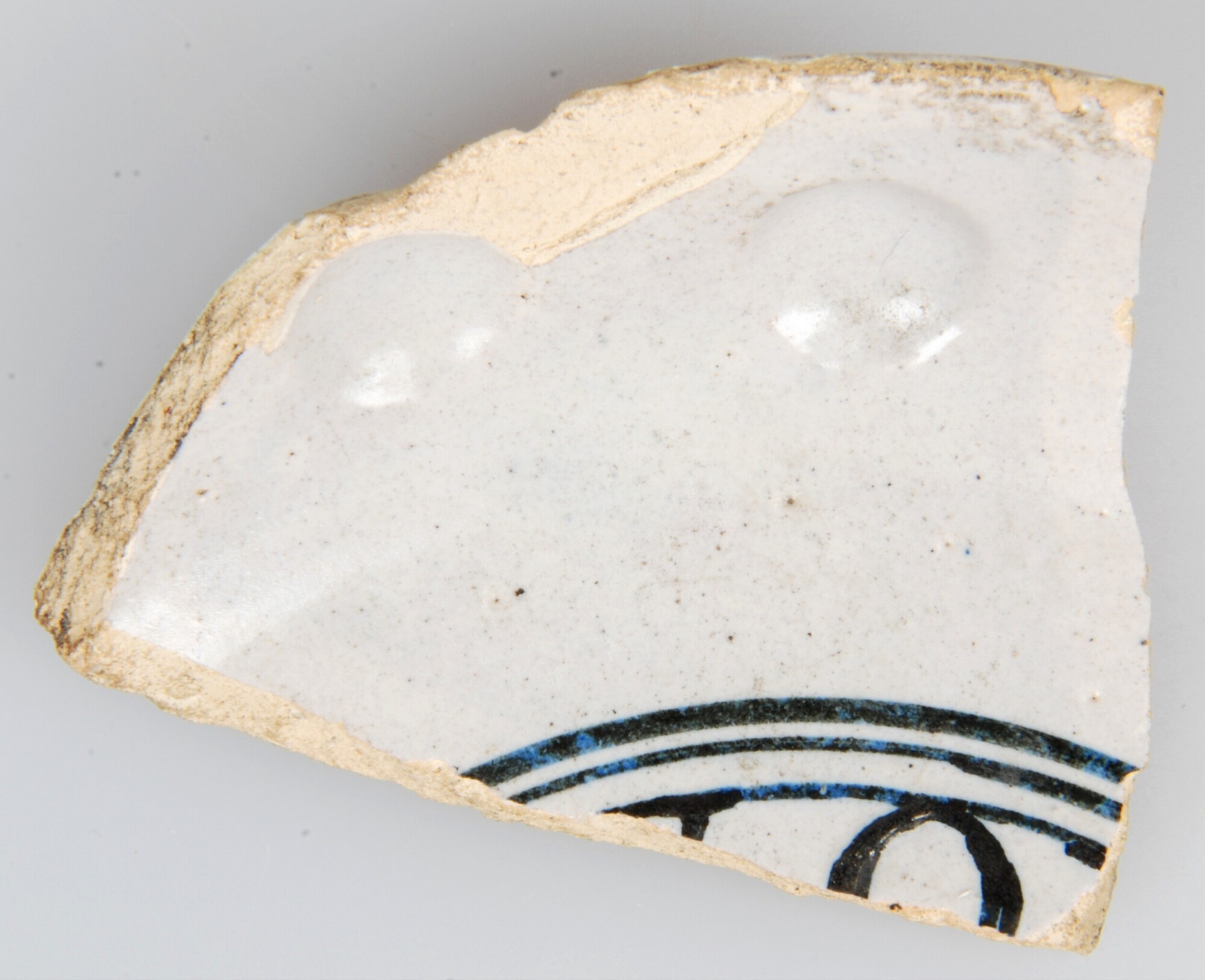 Schaal; m-dri-; majolica; rechte wand waarin noppen aanwezig zijn; inwendig tinglazuur, uitwendig loodglazuur; blauw op wit, spiegel: blauwe concentrische lijnen; standvoet