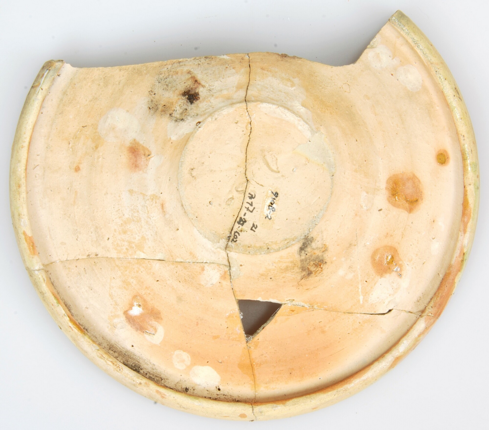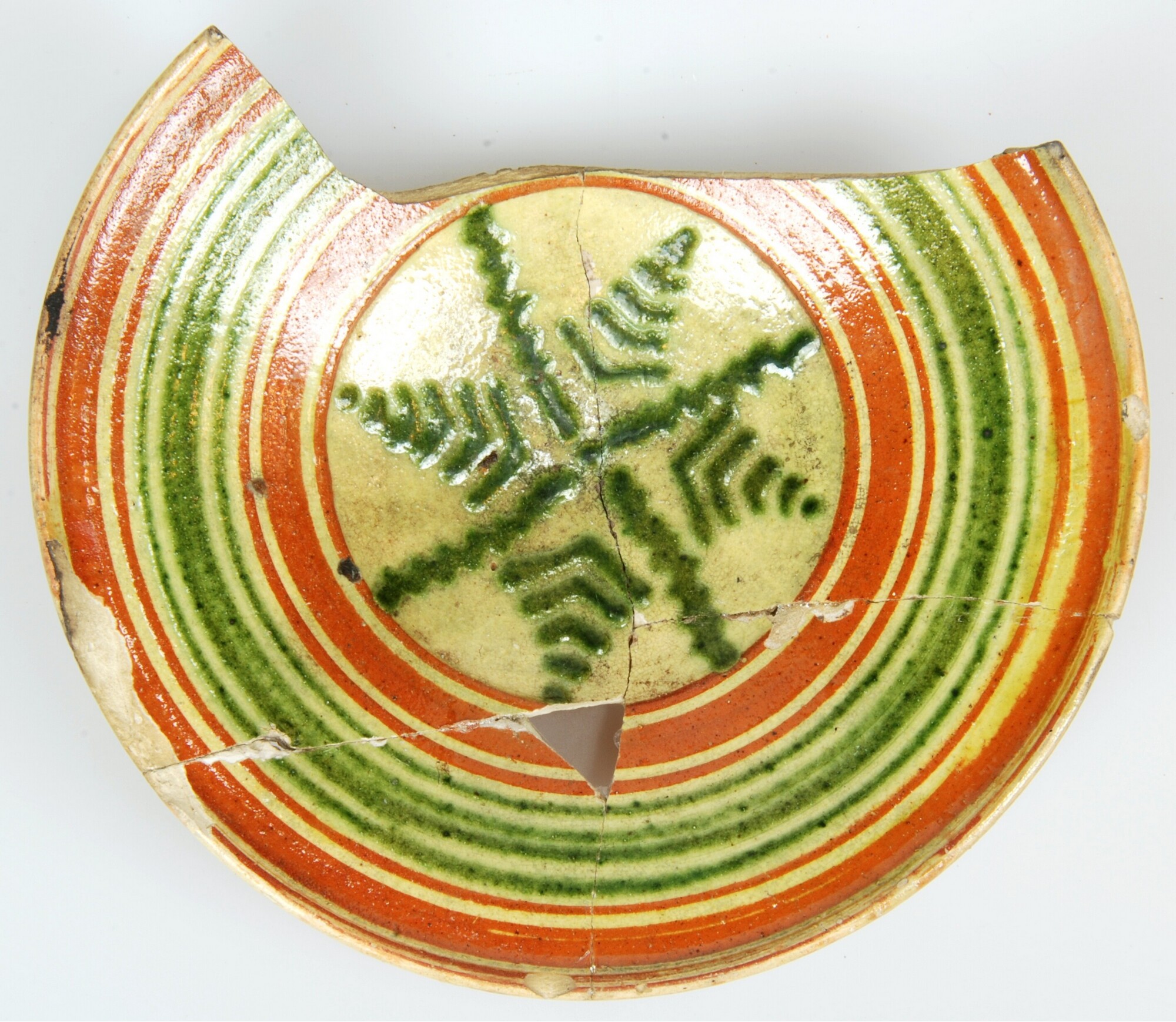 Bord; we-bor-1; diep bord met verdikte rand, op standvlak; Weser aardewerk; inwendig loodglazuur; decor van slib, plantmotief, accenten groen; standvlak; herkomst: Weser-gebied, Duitsland