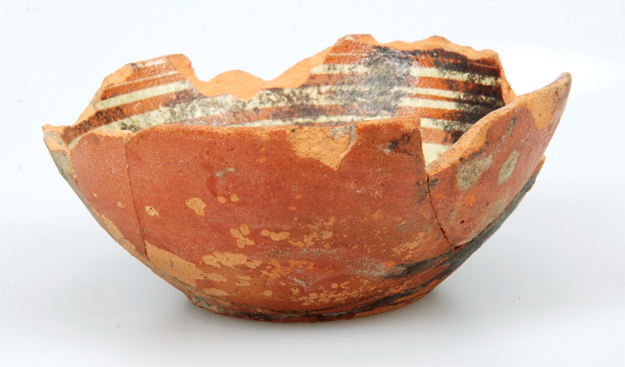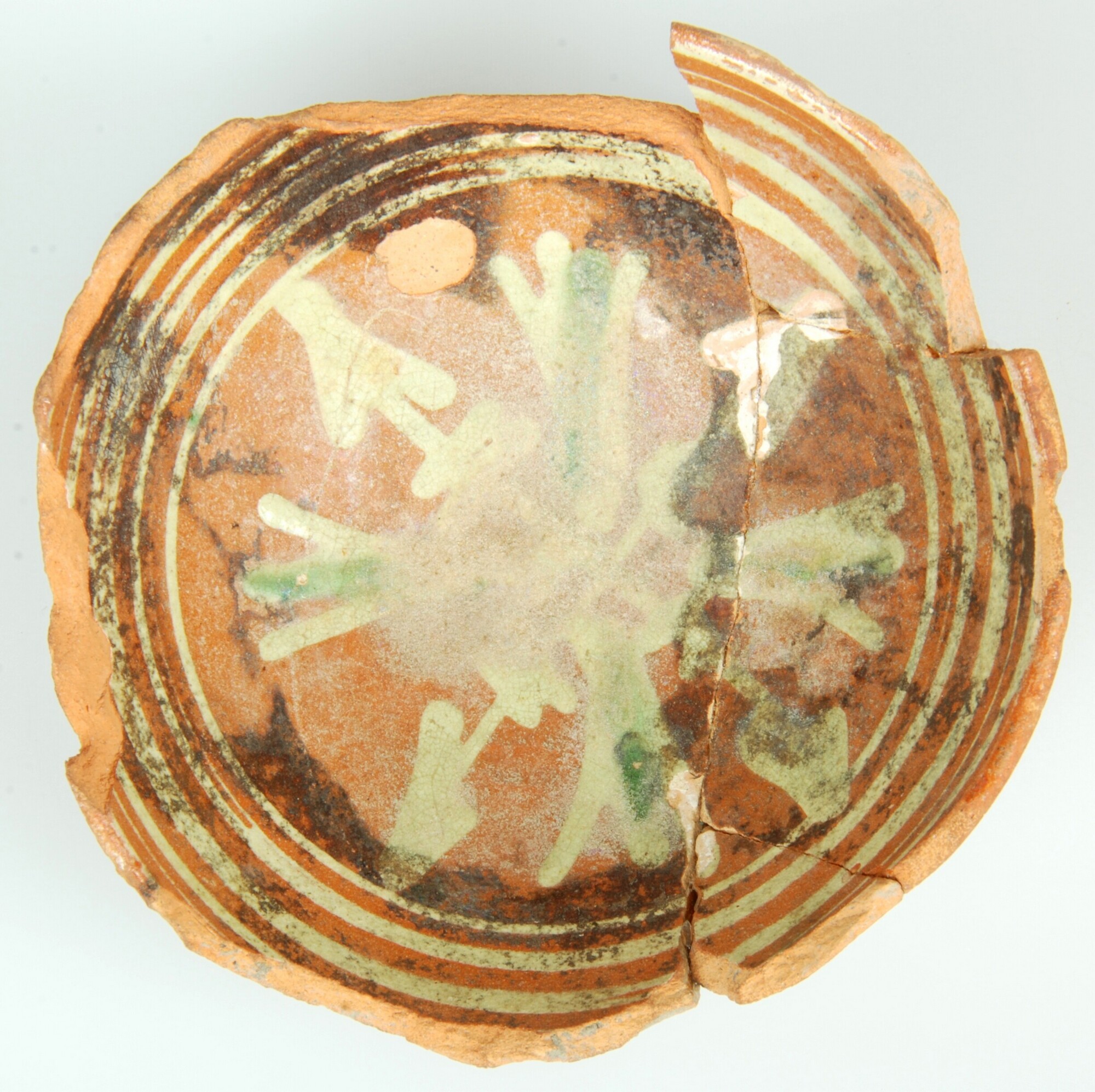 Kop; wa-kop-2; kop met rechte rand, op standvlak; Werra aardewerk; volledig loodglazuur; decor van slib, pijlen en concentrische cirkels, accenten groen; standvlak; herkomst: Werra-gebied, Duitsland