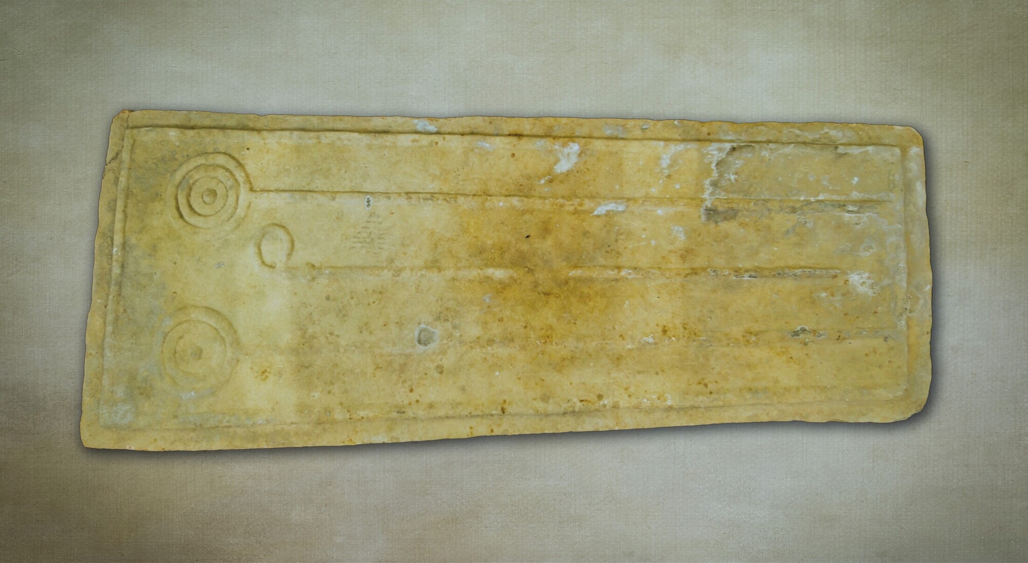 Sarcofaagdeksel; breed hoofdeinde en uitlopend in een smal voeteinde; versiering van een kromstaf in het centrale midden met aan weerszijden staven waarbij de bovenzijde uitloopt in twee cirkels met een punt in het midden; rechterbovenhoek bestaat uit twee verlijmde fragmenten