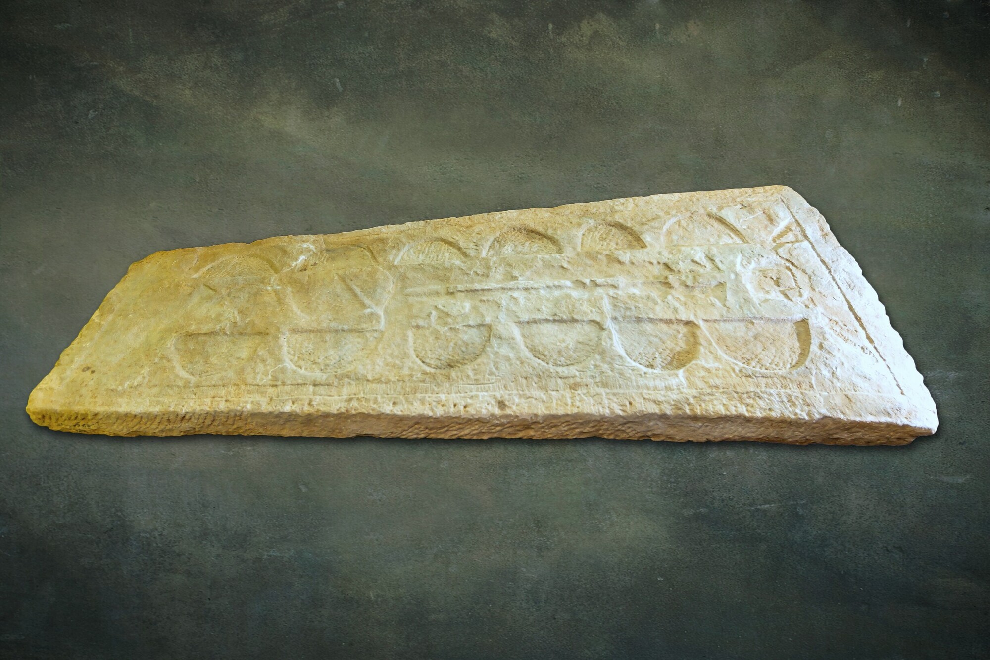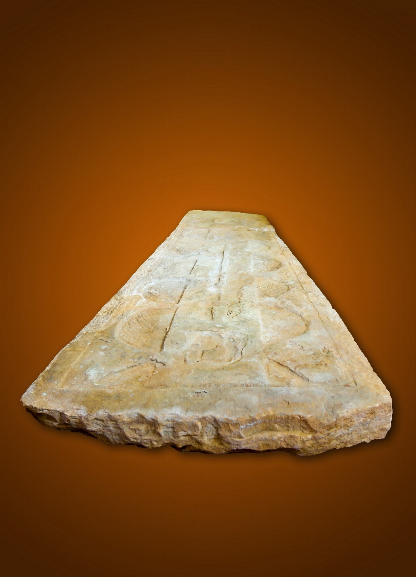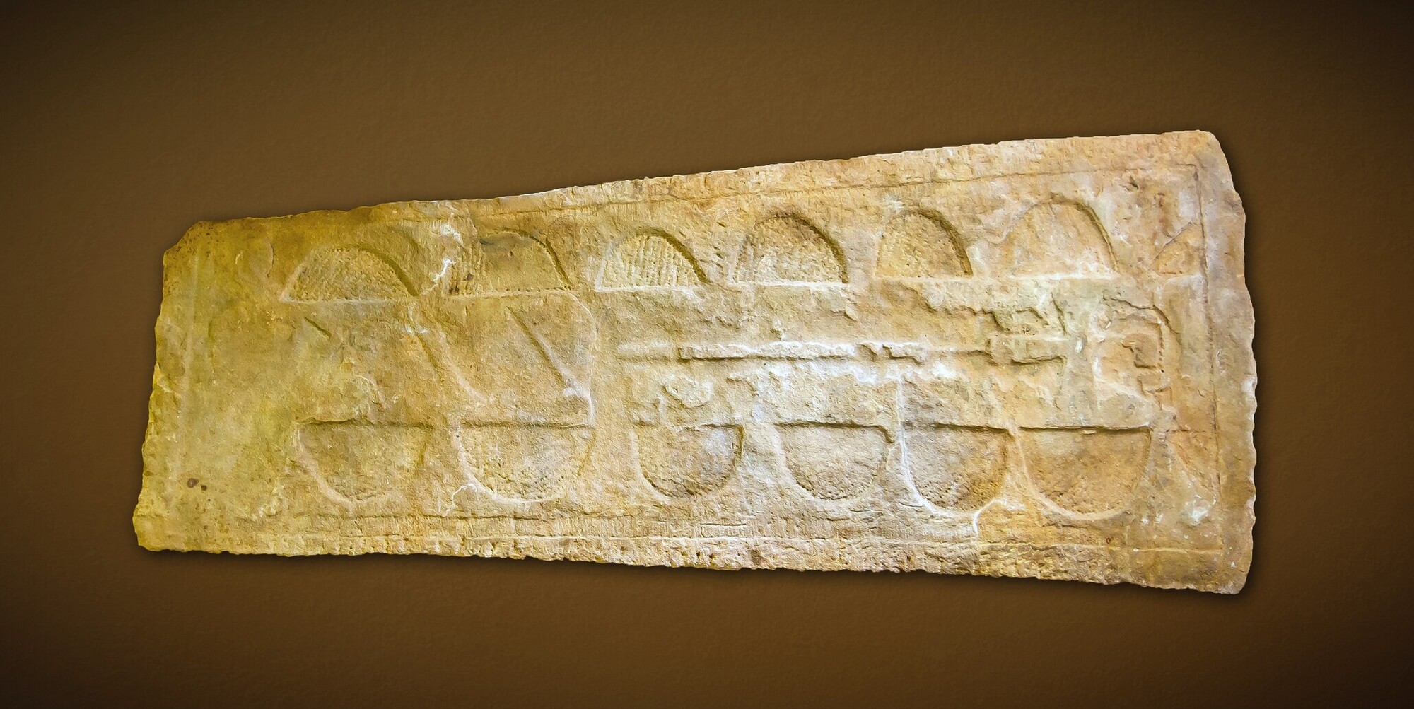 Sarcofaagdeksel; breed hoofdeinde en uitlopend in een smal voeteinde; versiering: binnen omlijsting, in het midden, een brede verticale strook, waarop een processiekruis; in de zijstroken aan weerskanten zes uitgediepte bogen; de grond van deze bogen is met de puntbeitel in een soort kruisversiering behakt; oppervlak verder glad