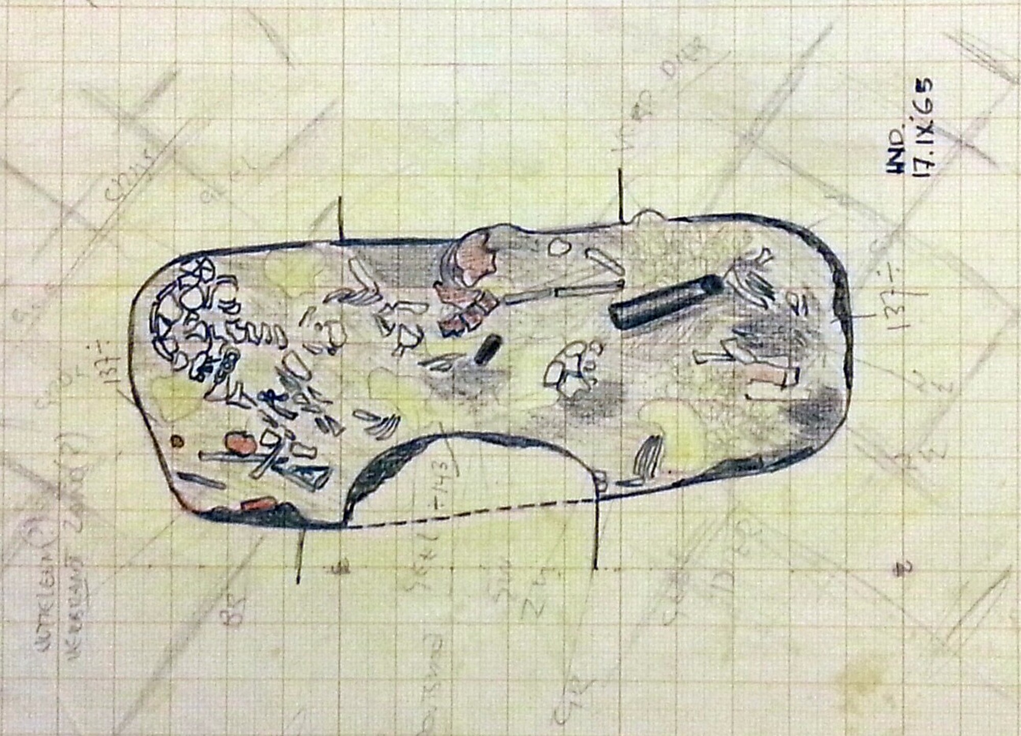 Het aangetroffen graf in tumulus 2, vak H19, staat bekend als een secundair, tangentiaal graf. Het betreft een rechthoekige kuil van 1.3 bij 0.5 meter. In het graf bevond zich een 35-40 jaar oude vrouw, welke op haar rechterzijde ter ruste was gelegd op verkoolde stammetjes hout. Voor het dichtwerpen van de grafkuil heeft men ...