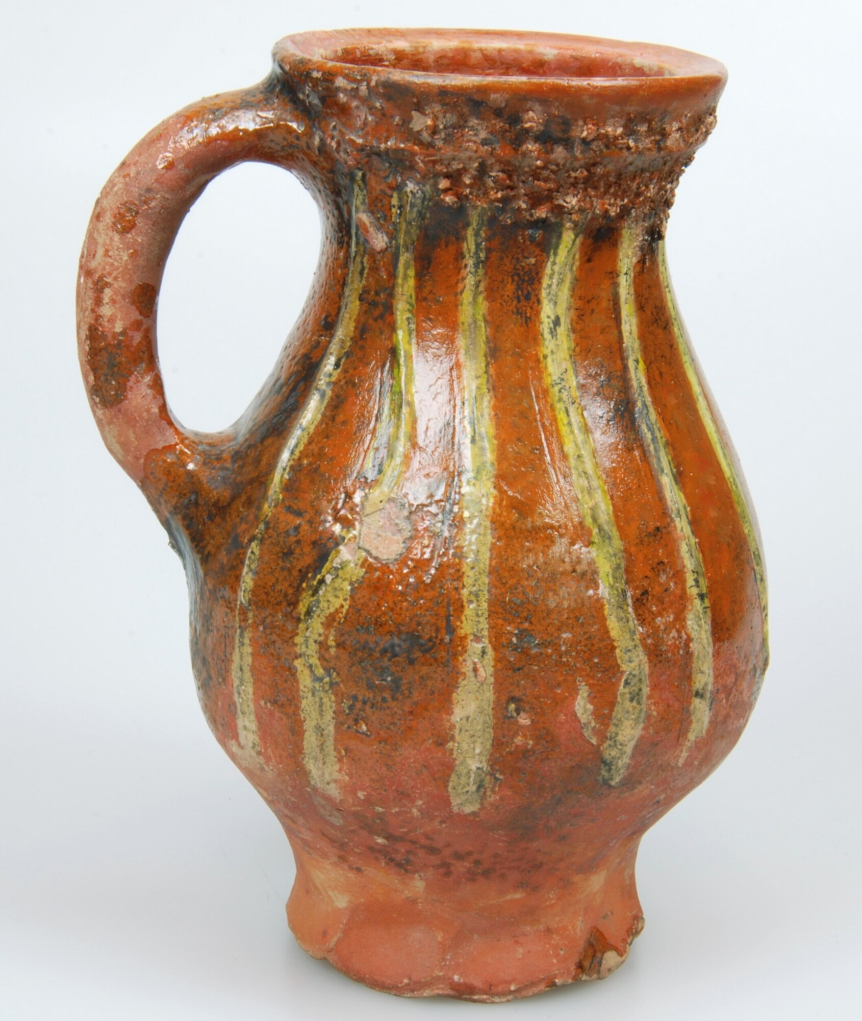 Kan; r-kan-93; hoge, bolle kan met naar binnen gebogen, afgeronde kraagrand, geknepen standvoet (vingerindrukken), verticaal worstoor; roodbakkend aardewerk (Vlaams-hoogversierd aardewerk); patroon van verticale lijnen van aangebrachte witte kleistrips; vlak onder de rand een decoratie van potgruis; gat in bodem; herkomst: Nederlanden