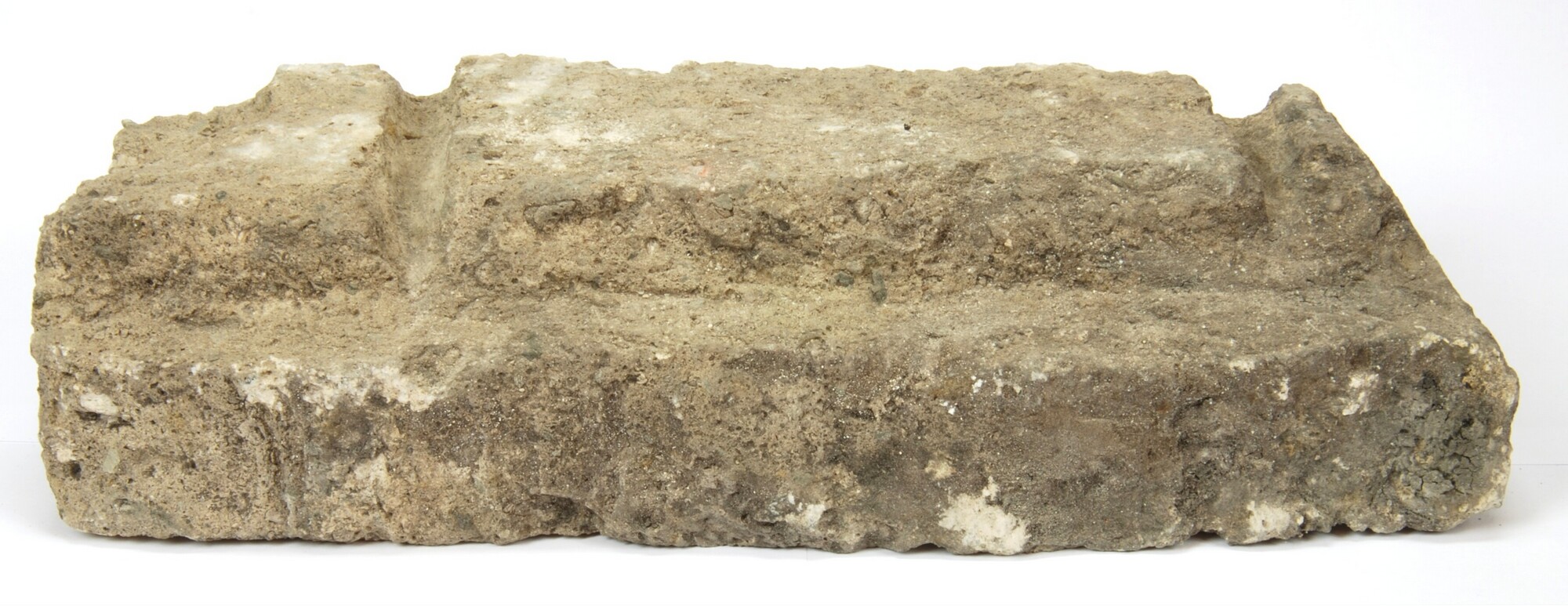 Bouwmateriaal; tufsteen; lang blok waarbij een deel van de kopse kant mist; aan een zijde is een 30 mm brede, inspringende lijst over de hele lengte van het blok aangebracht met twee v-vormige groeven daar loodrecht op; mogelijk onderdeel van een steenkist