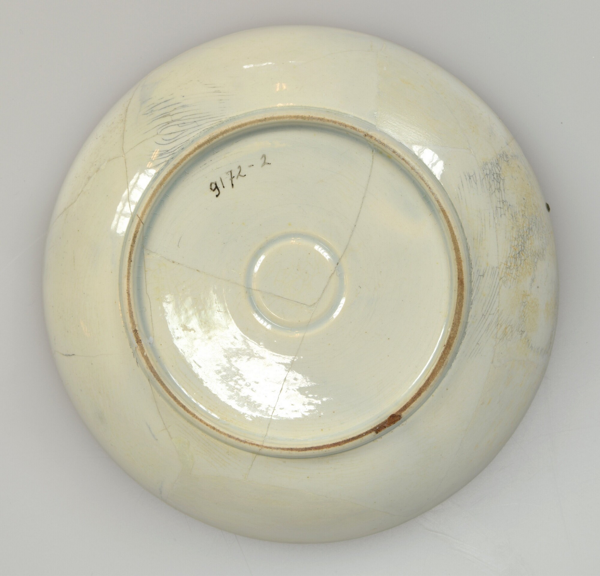 Schotel; iw-bor-3; afgerond klein bord zonder vlag, standring; industrieel wit aardewerk (pearlware); loodglazuur; inwendig onderglazuur blauwe beschildering: strobloemendecor rond cirkels; imitatie Duits porselein; herkomst: Engeland