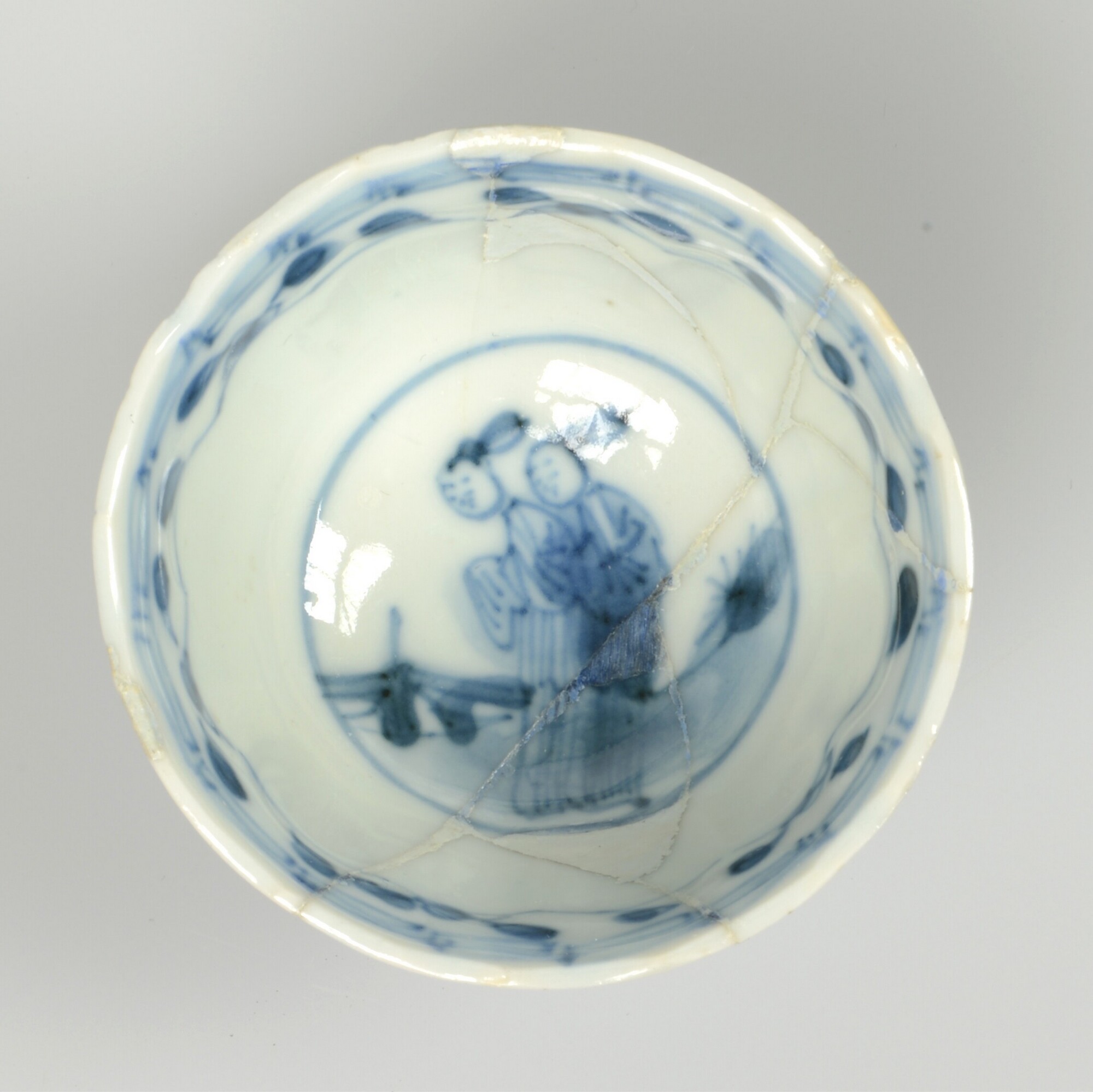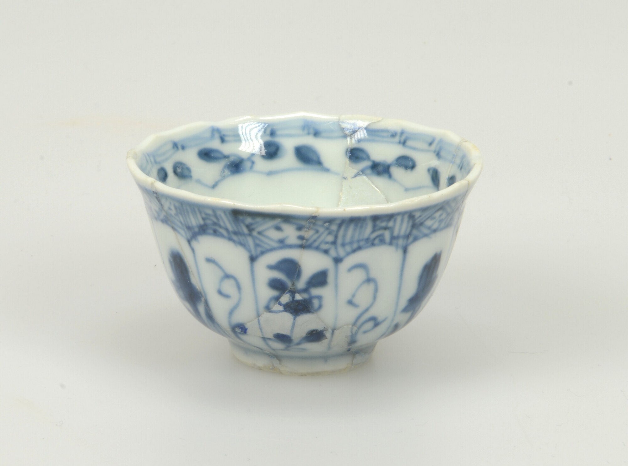Kop; p-kop-9; Aziatisch porselein; veldspaatglazuur; Kangxi-periode; uitwendig: 12 panelen met bloemen, accolade rand; inwendig: accoladerand en mensfiguren op ziel; bloemvormige rand; standring
