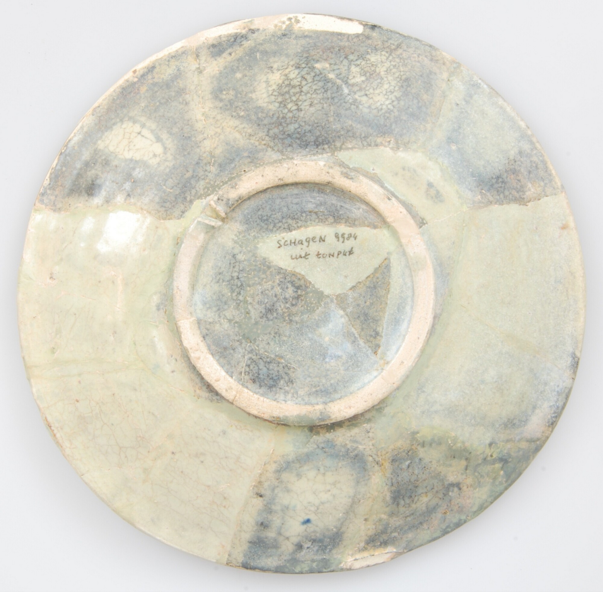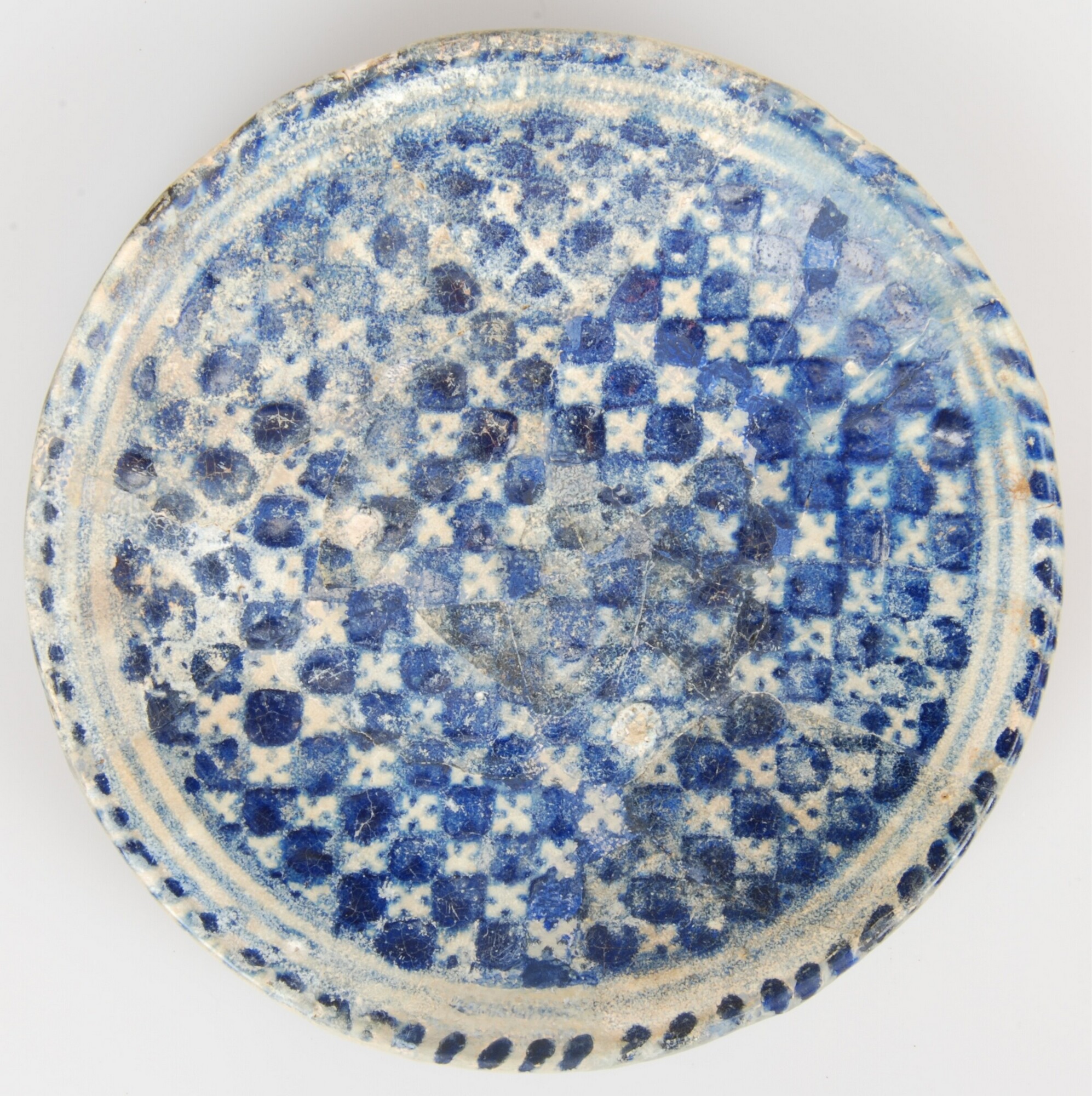 Bord; m-bor-5; majolica; inwendig tinglazuur, uitwendig loodglazuur; blauw-wit schaakbordmotief; standring; herkomst: Holland; vondstomstandigheden: uit tonput
