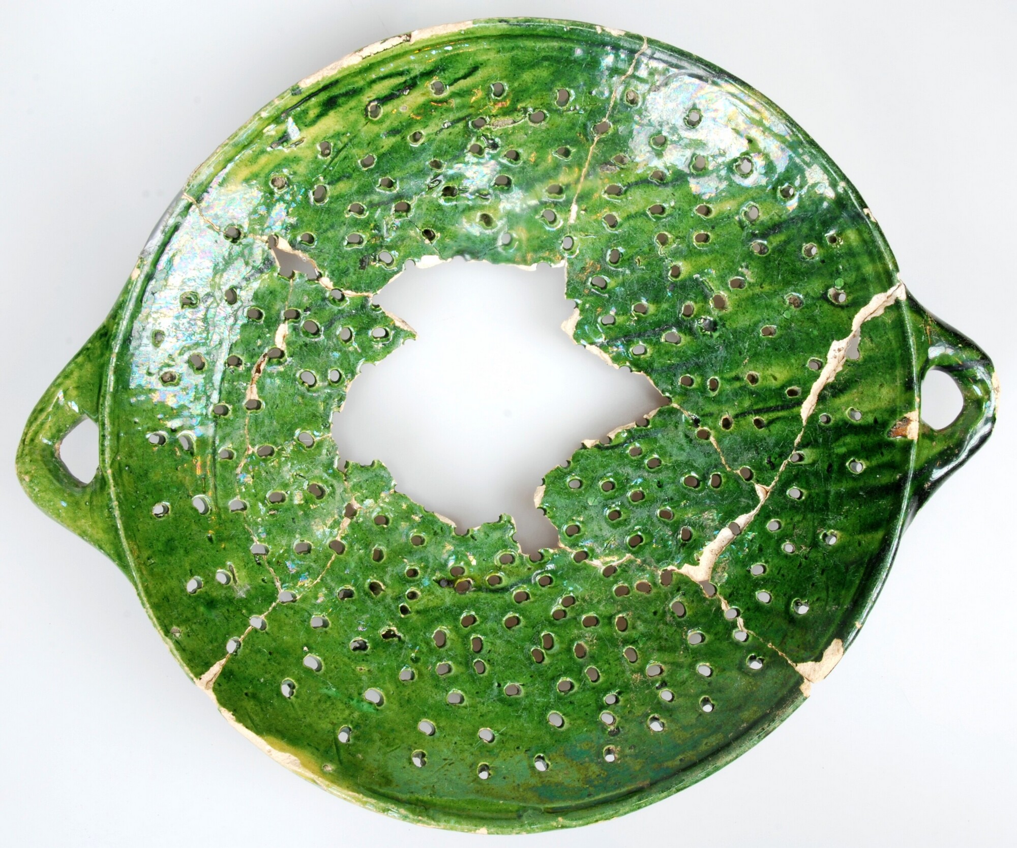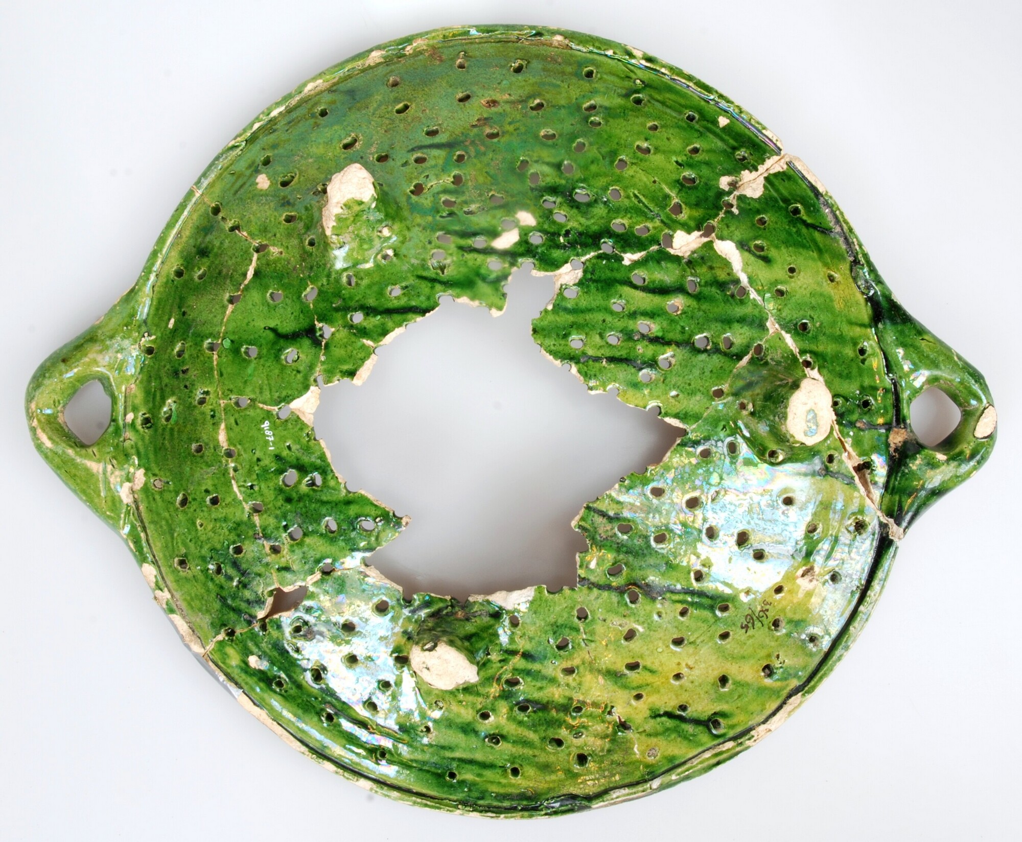 Lekschaal; w-lek; witbakkend aardewerk; loodglazuur met koperoxide; drie poten; twee horizontale worstoren
