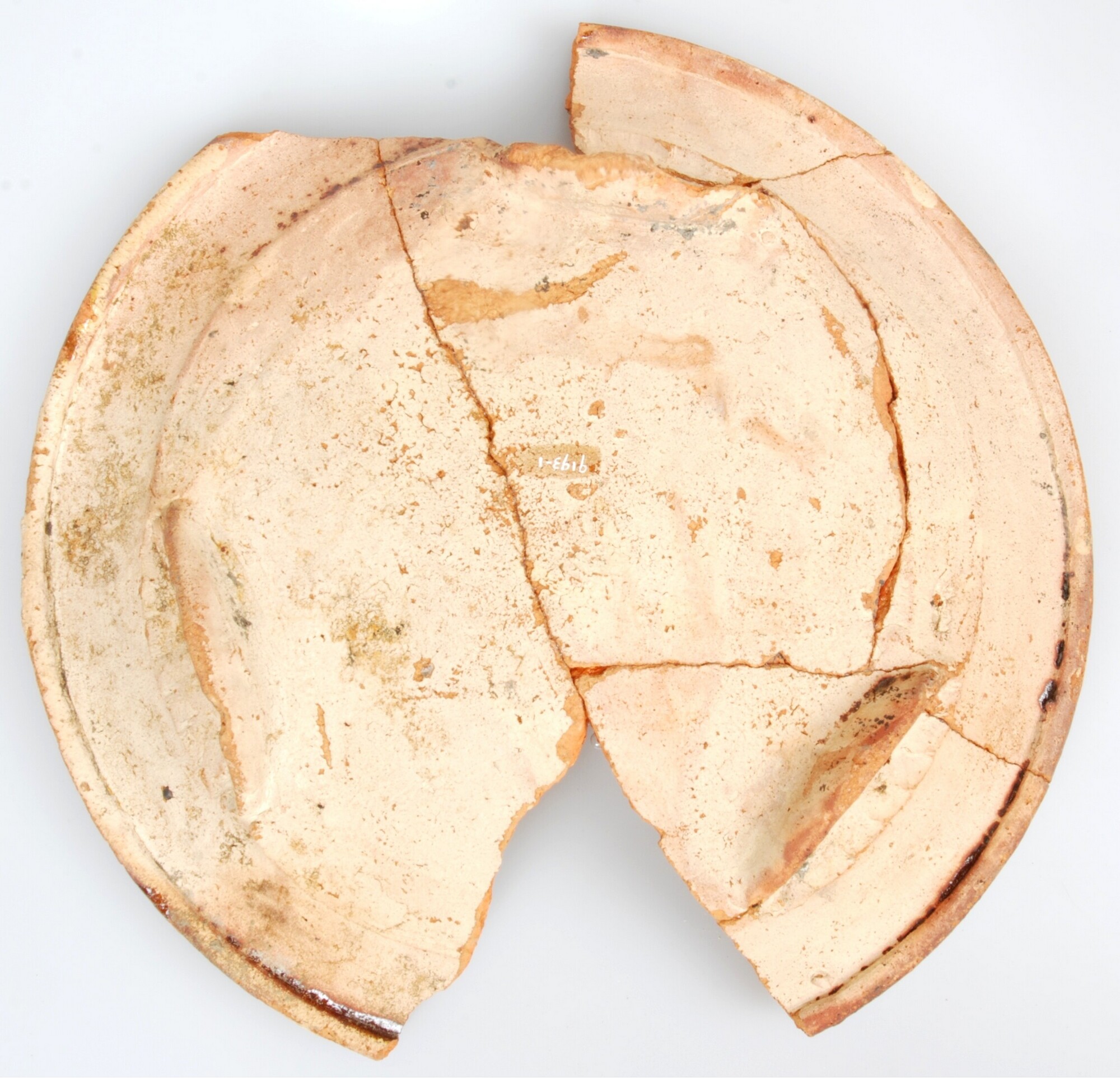 Bord; r-bor; roodbakkend aardewerk; loodglazuur met koperoxide; drie standlobben