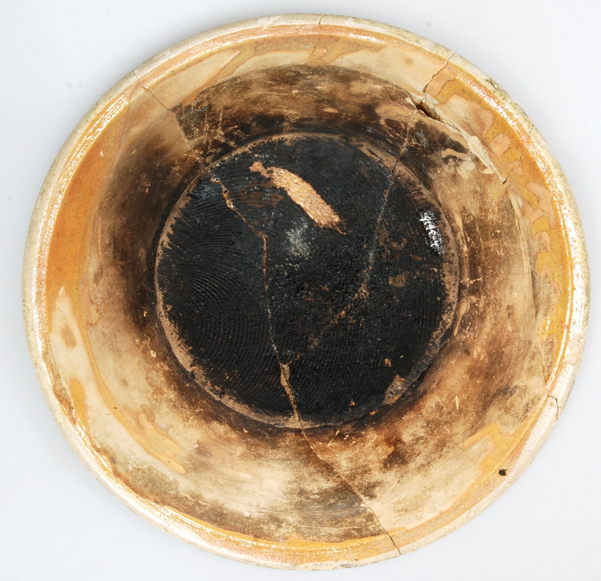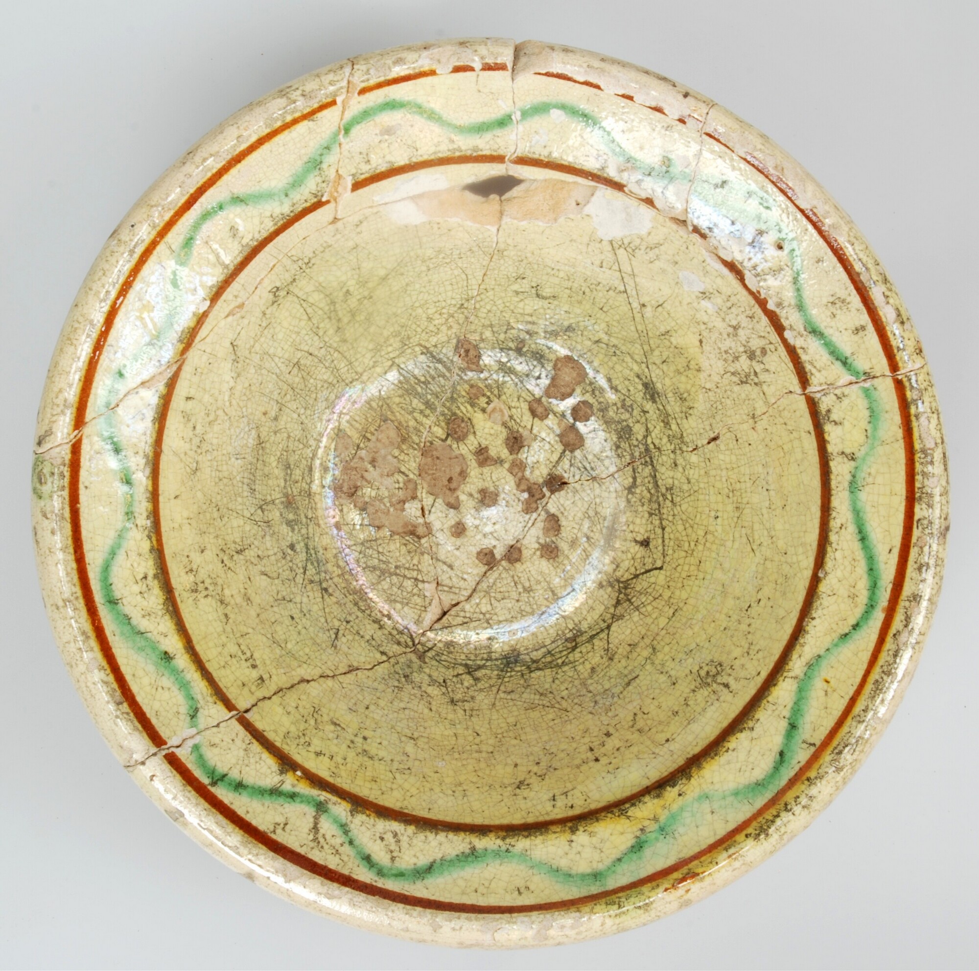 Bord-; w-bor-4; loodglazuur; Frankfurter waar; diep conisch bord met verdikte ronde rand; standvlak; vlag: groene golflijn tussen twee bruine concentrische cirkels; datum: 12-5-11; vondstomstandigheden: tussen palen aan westzijde sleuf/kerk in zuidtalud