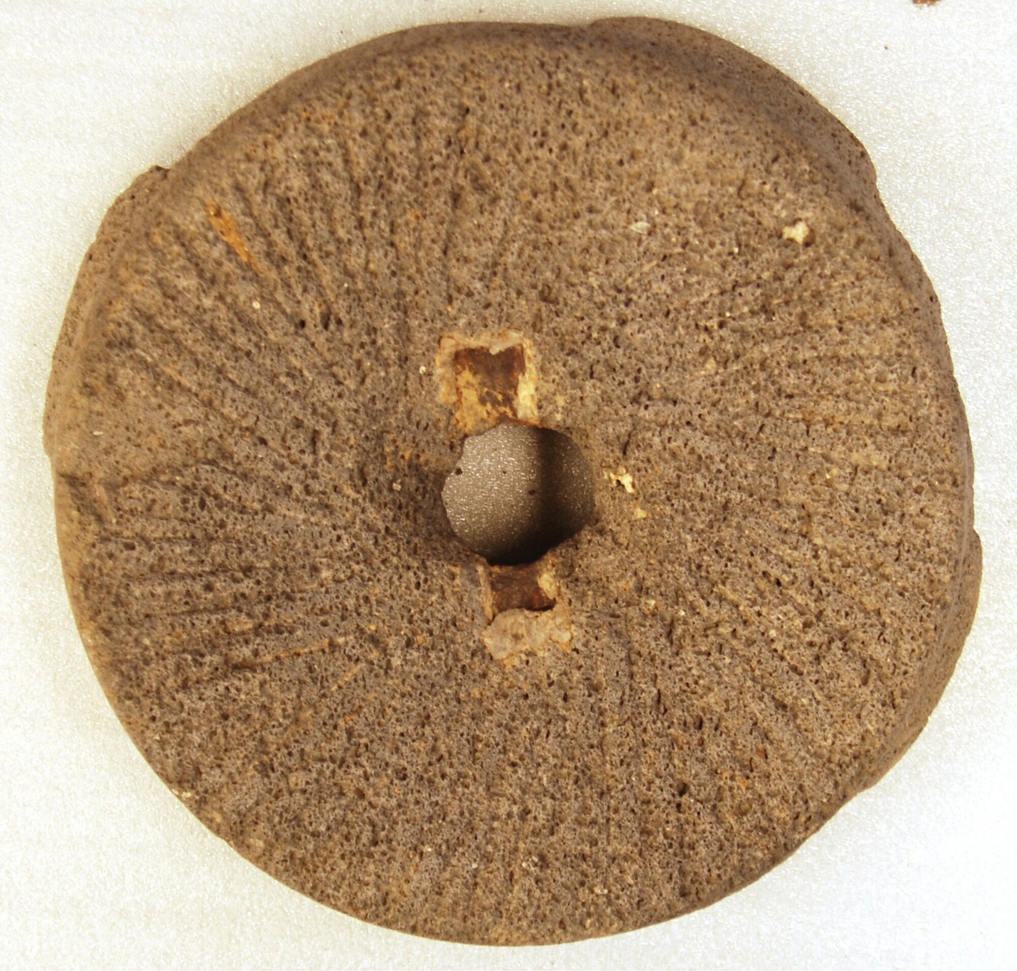 Maalsteen; tefriet; licht gebogen groeven en tweearmig molenanker