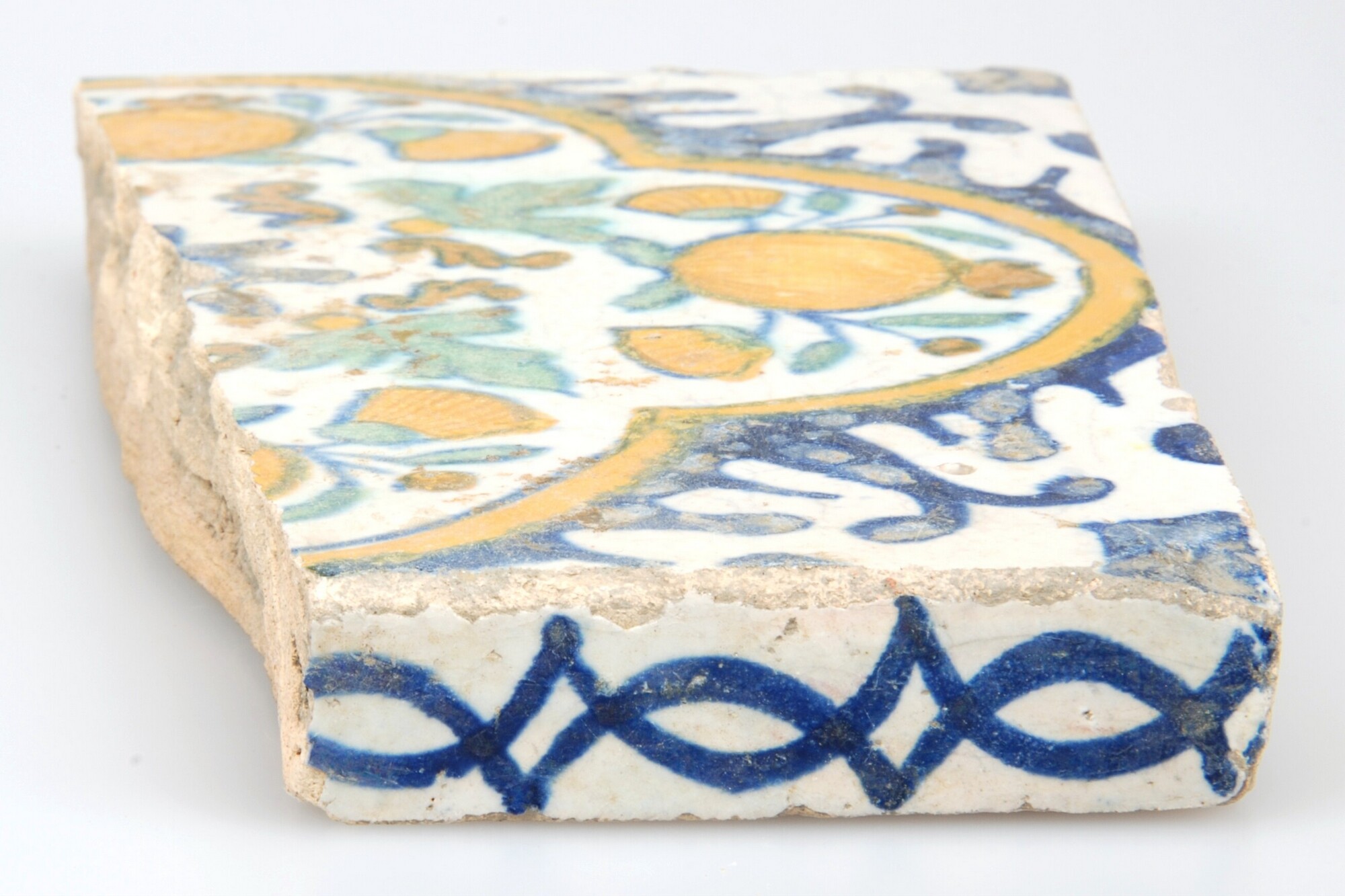 Nisvloertegel/nistegel; tinglazuur; polychroom; vierpas met daarin oranjeappels en goudsbloemen, pompadourtegel; het uit de nis stekende deel is beschilderd met slingermotieven; hoekmotief: palmet; datum: 16-5-11; vondstomstandigheden:aslaag