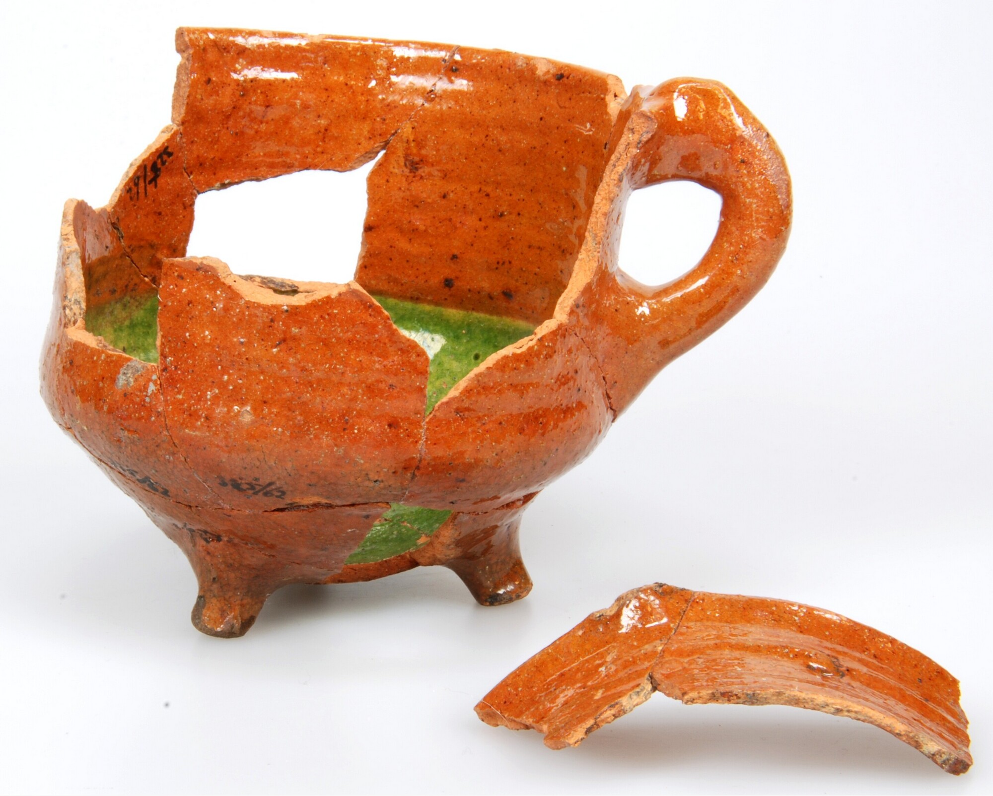 Grape; r-gra-49; roodbakkend; buitenzijde: loodglazuur, binnenzijde: loodglazuur met koperoxide; wijdmondige grape met afgeronde buikknik of ronde buik, vrijwel verticale wand en licht uitgebogen rand; verticaal worstoor, schenklip en 3 poten