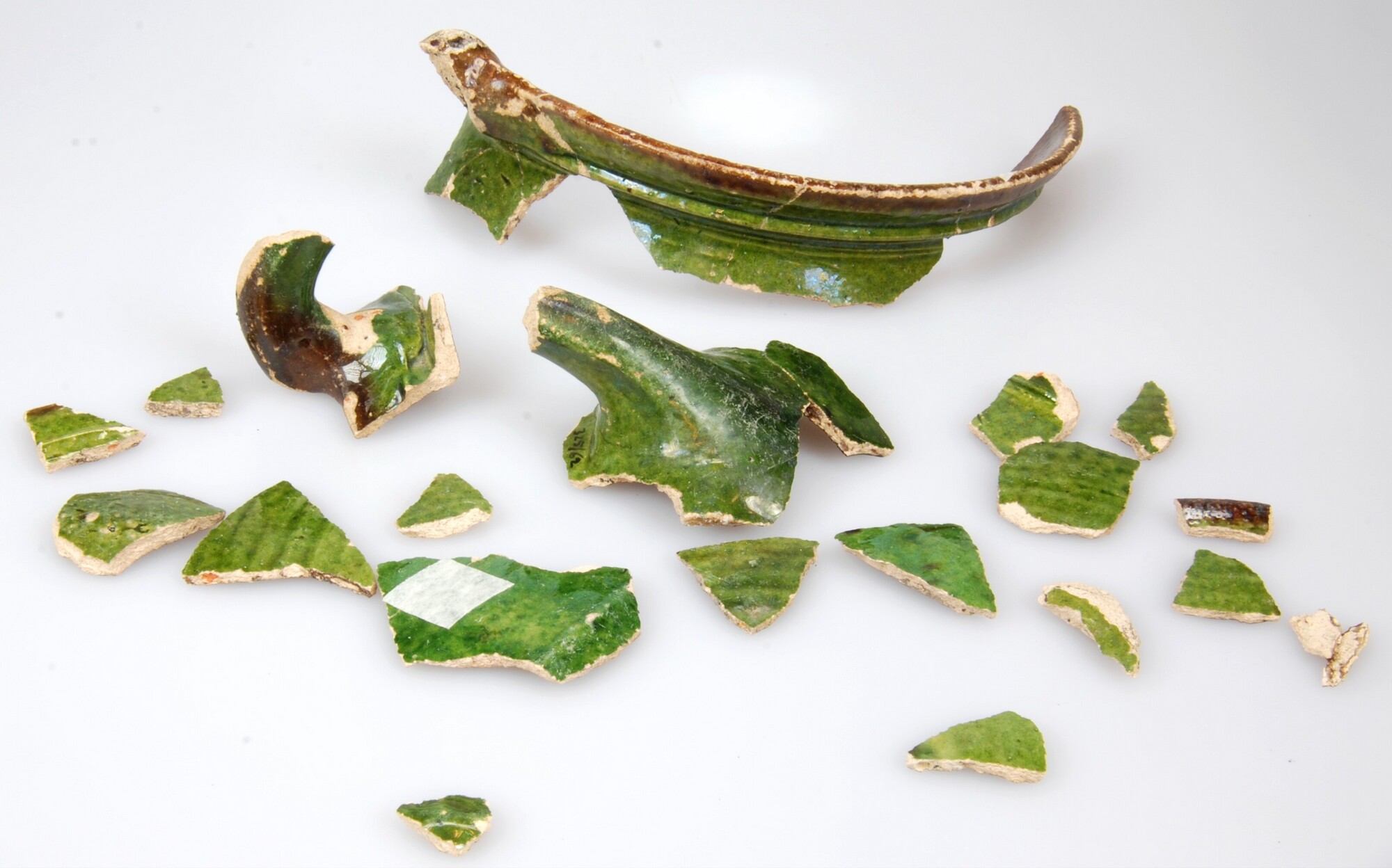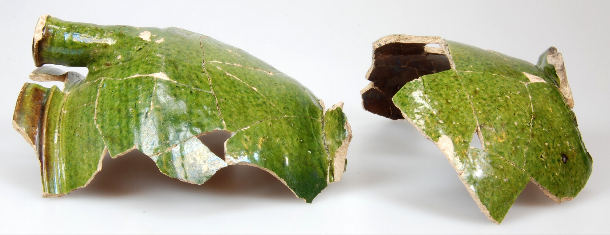 Pot; w-pot-?; witbakkend; loodglazuur met koperoxide; pot met scherpe buikknik, ribbel op schouder en kraagrand met dekselgeul; tuit; verticaal worstoor; stanring; 1-9