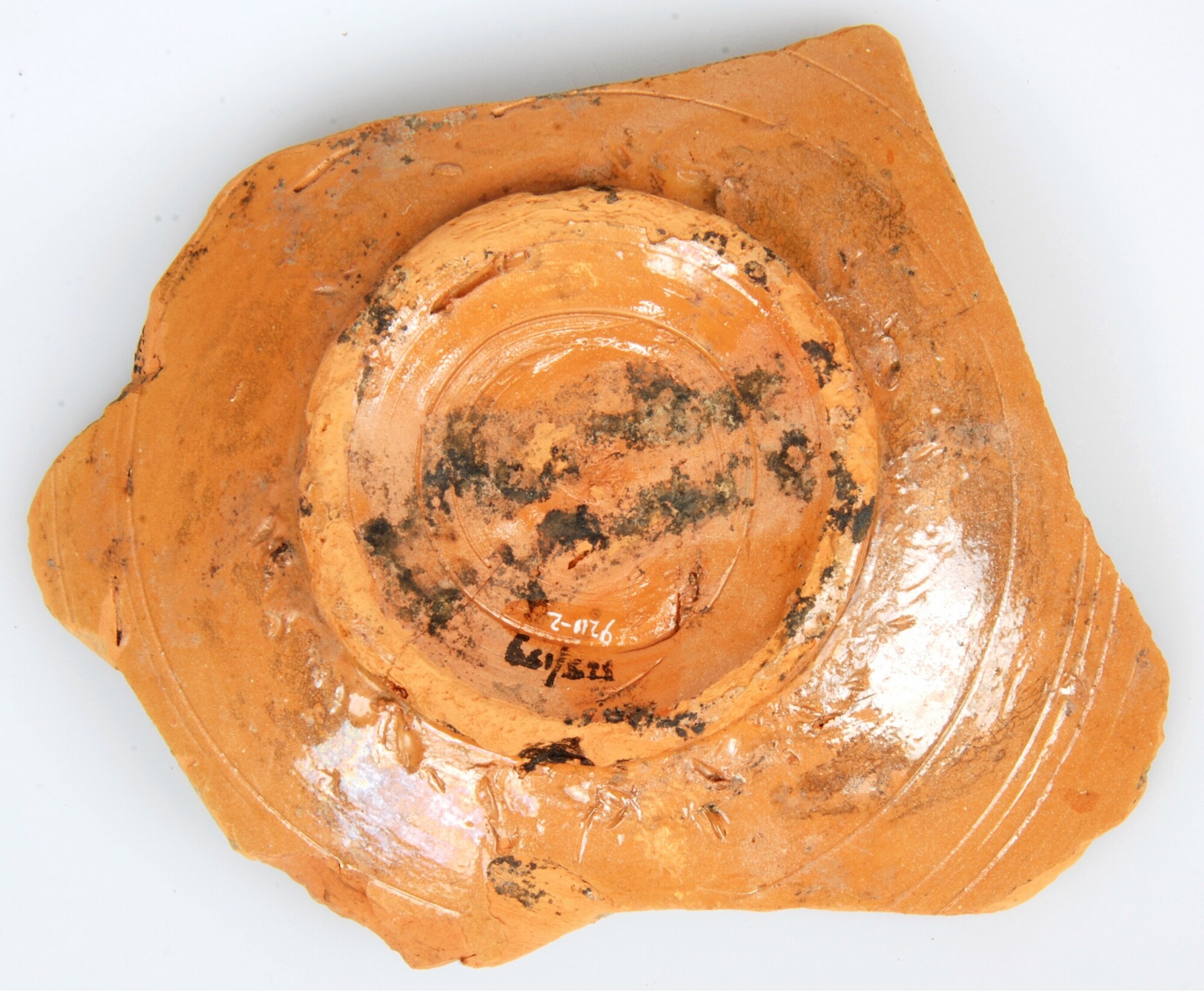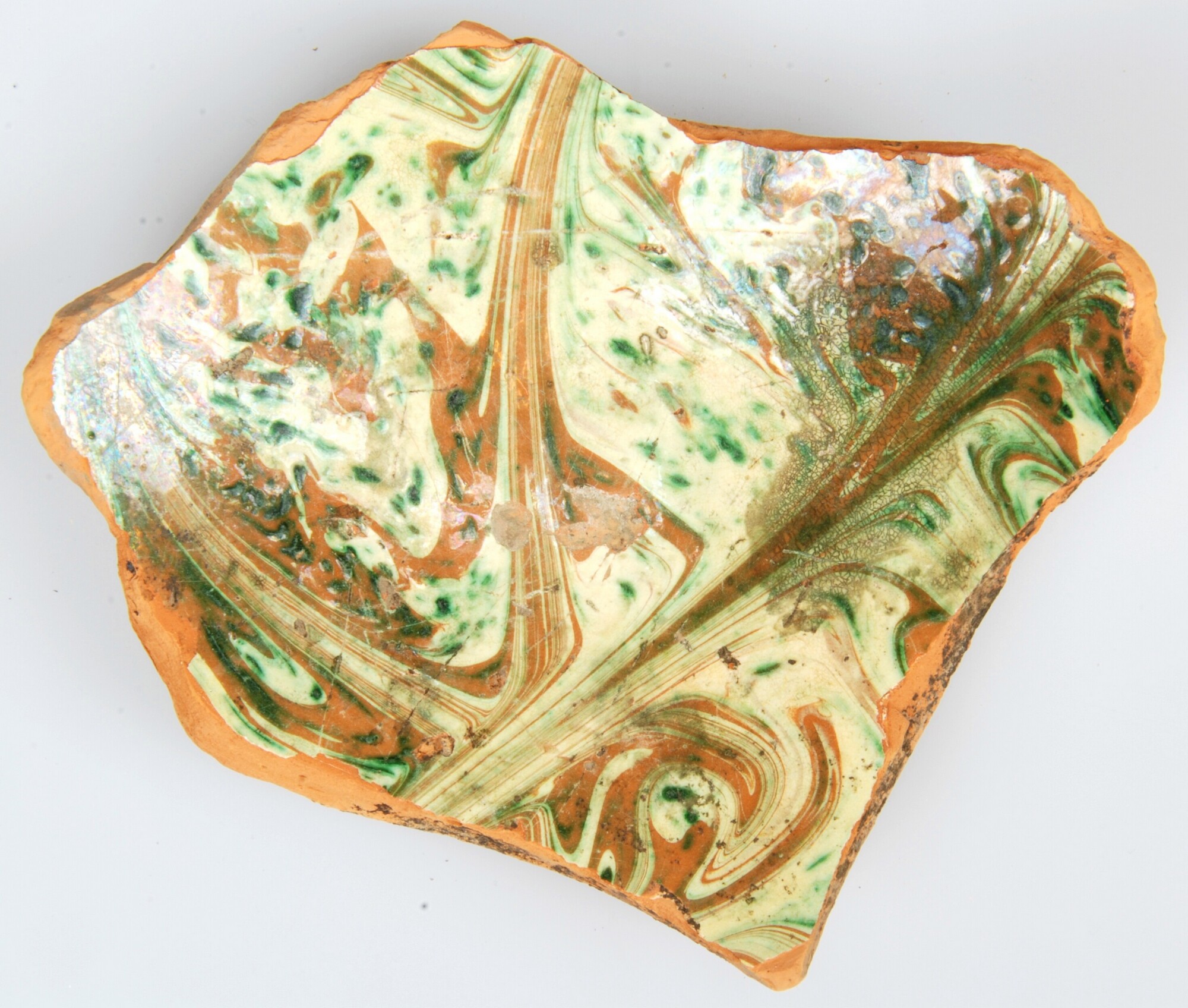 Bord; ri-bor-?; roodbakkend marmorizzata aardewerk ; loodglazuur; spiegel: gemarmerd: rood, groen en geel; standring; herkomst: Italie, Toscane (marmorizzata)