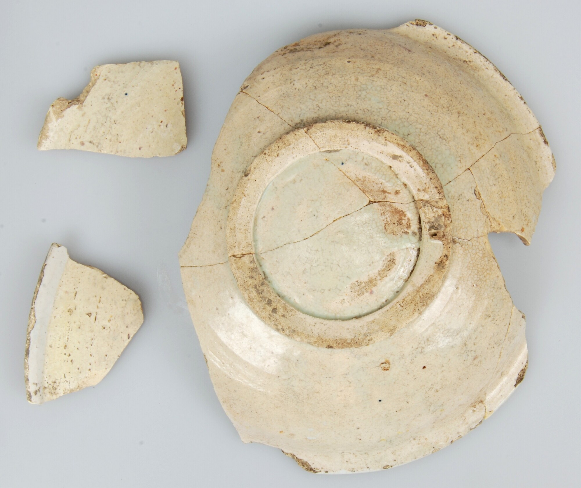 Bord: m-bor-?; majolica; tin/loodglazuur; geel/paars/blauw; spiegel: vogel op vergiet (?); standring; datum: 25-11-11, vondstomstandigheden: talud