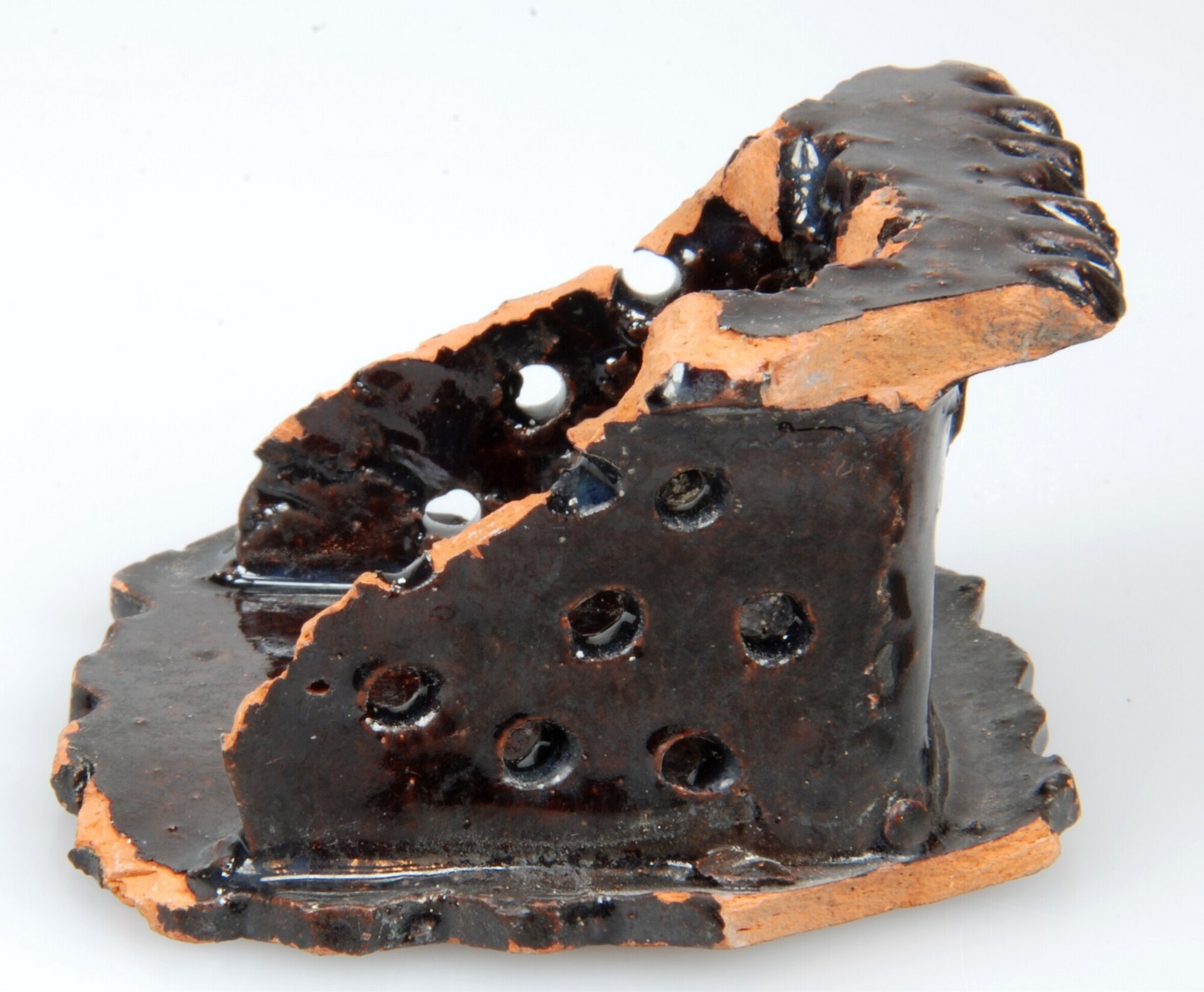 Miniatuur stoof; r-min-?; roodbakkend; mangaanglazuur; vierkante stoof met kartelranden en luchtgaten in de wand; datum: 29-06-12