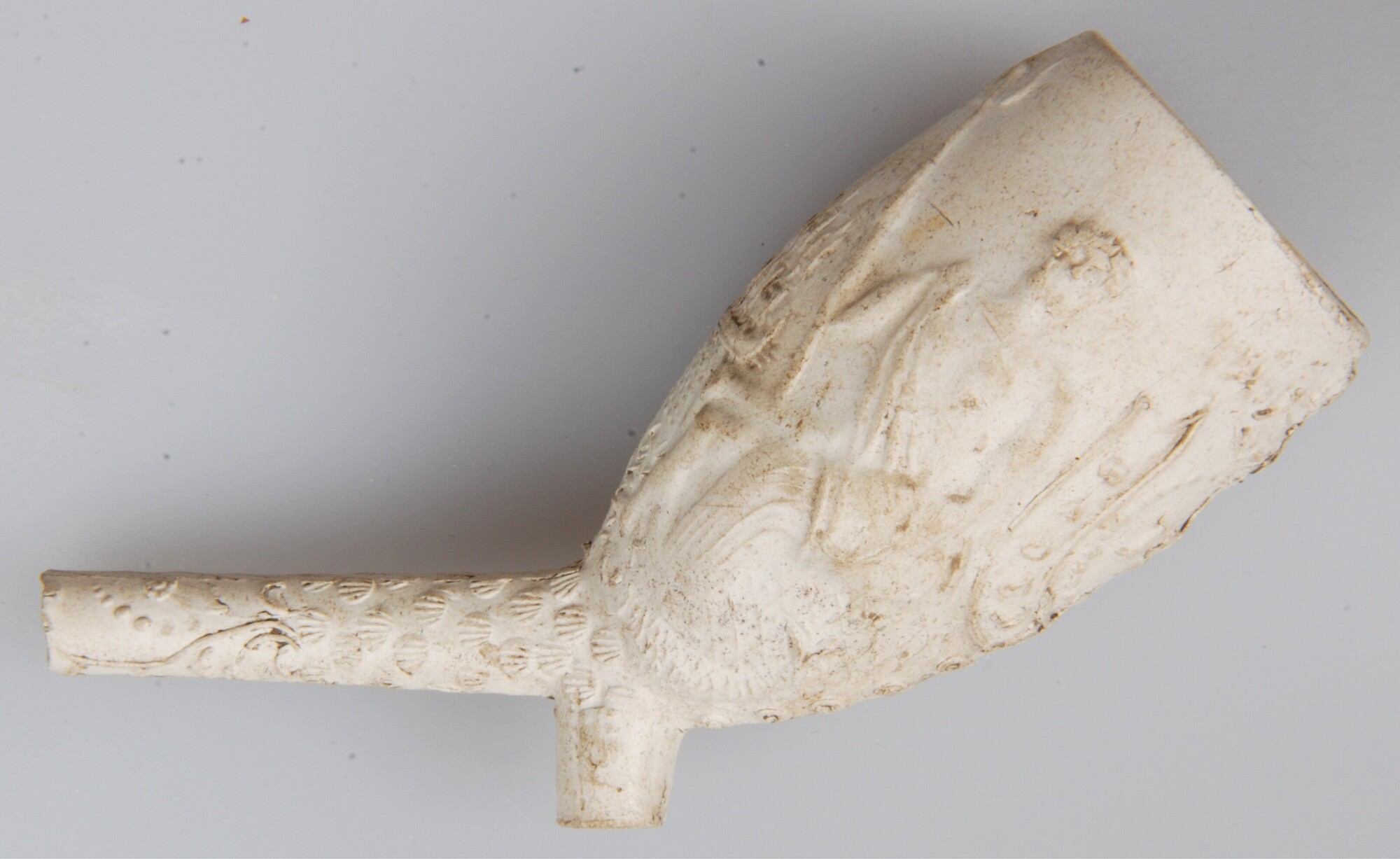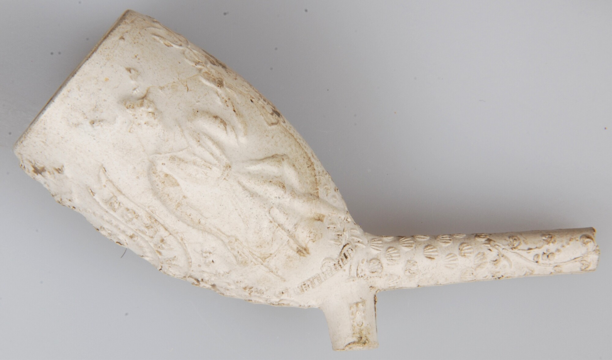 Pijpenkop; pijpaarde; voorzijde: twee zeilschepen; links: Mercurius; rechts: Neptunes; achterzijde: gekroonde initialen ES omringt door een tekstband met ‘Goedewaagen’; ES; de steel is voorzien van schubben; herkomst: Gouda; datum: 29-06-12