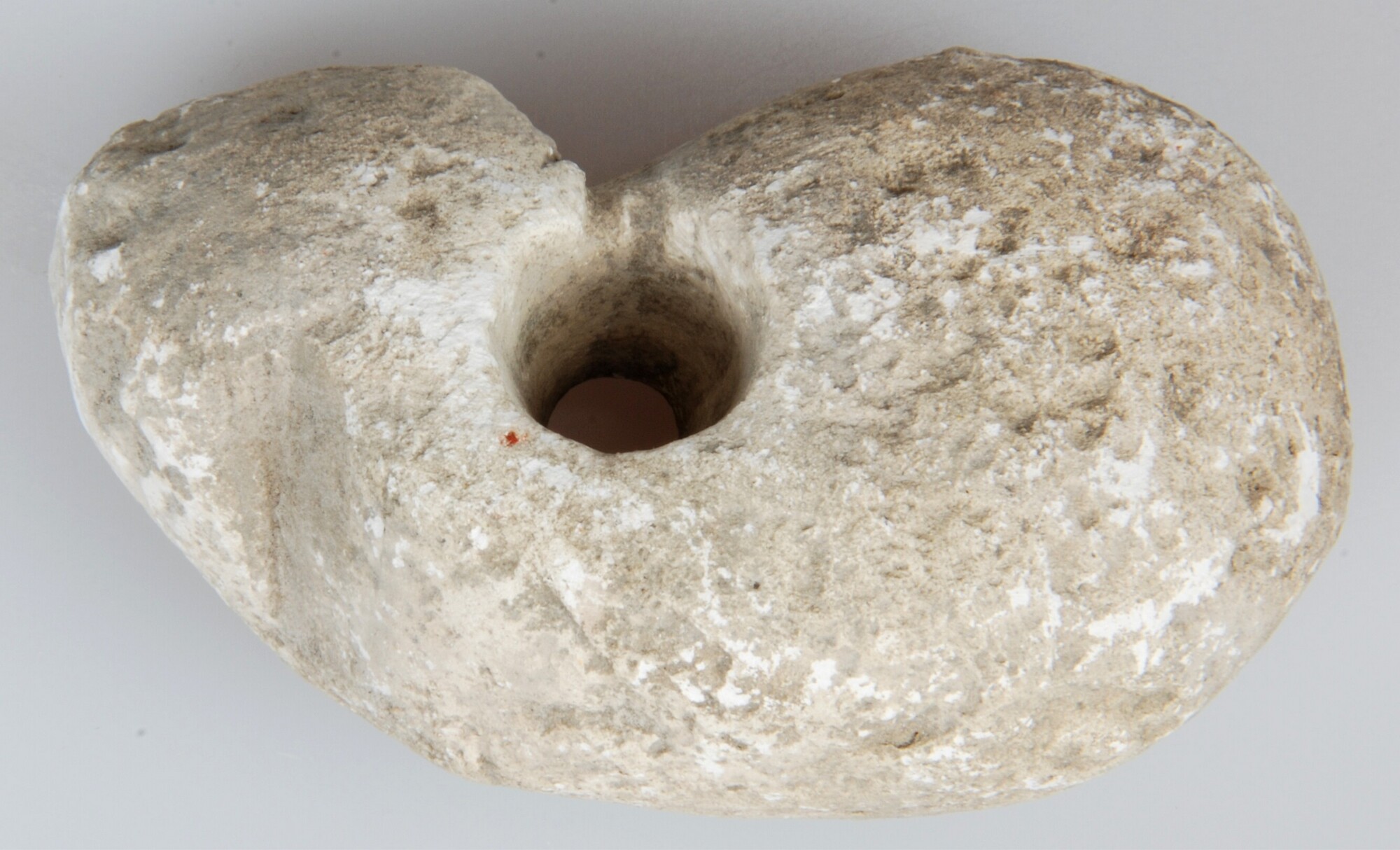 Kalksteen; brok kalksteen met aan de boven- en onderzijde een tapstoelopende doorboring; datum: 26-06-11